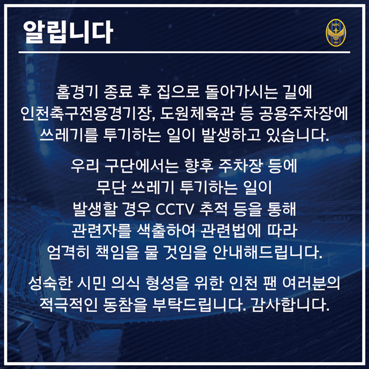 홈경기 종료 후 일부 관중 여러분께서 집으로 돌아가시는 길에 인천축구전용경기장, 도원체육관 등 공용주차장에 쓰레기를 무단으로 투기하는 일이 반복하여 발생하고 있습니다.