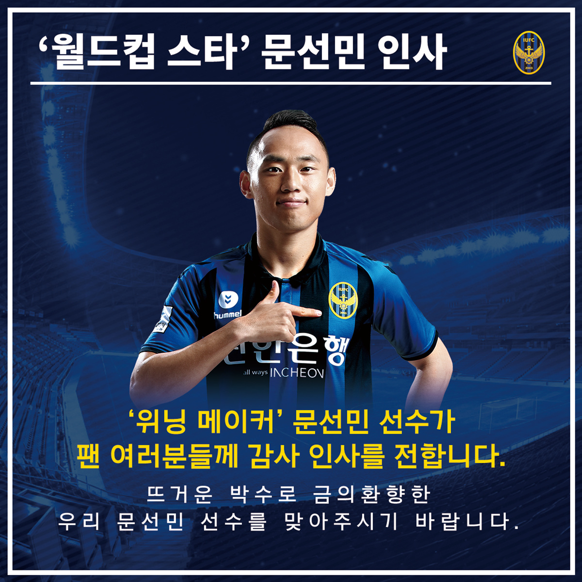 대한민국 축구 국가대표로 ‘2018 FIFA 러시아 월드컵’ 일정을 무사히 마치고 돌아온 우리 인천유나이티드 ‘위닝 메이커’ 문선민 선수가 인천 팬 여러분들께 직접 감사의 인사를 전합니다.