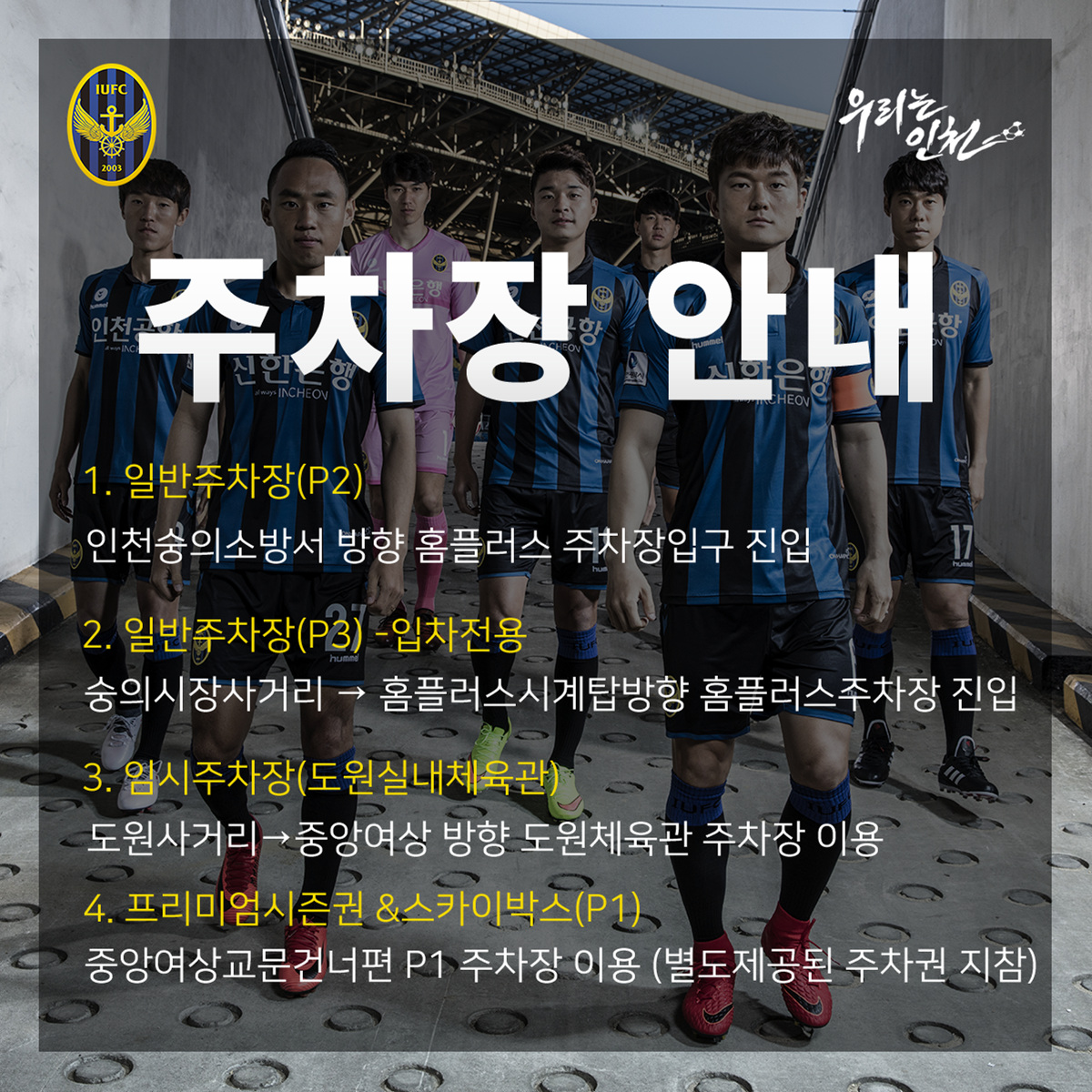 대중교통을 이용한 홈경기 방문을 권장합니다! 우리 인천유나이티드의 홈구장 인천축구전용경기장은 국철 도원역, 수인선 숭의역에서 각각 하차하시면 됩니다. 교통체증 방지 그리고 환경오염 방지를 위해 팬 여러분의 대중교통 이용을 다시 한 번 부탁드리겠습니다. 감사합니다.