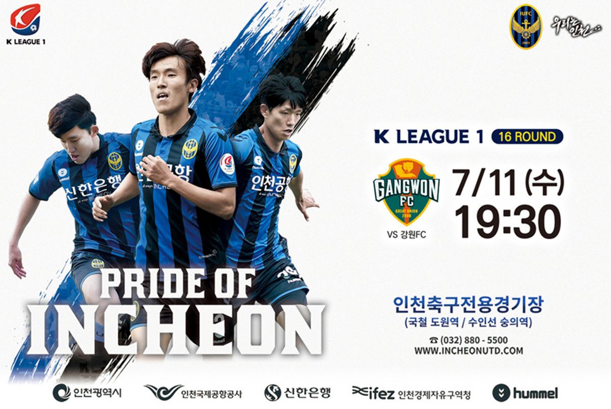 7/11(수) 오후 7시 30분. 우리 인천유나이티드가 강원FC를 상대로 올 시즌 9번째 홈경기를 치릅니다. 올 시즌 2번째 승리를 노리는 인천의 위대한 도전에 팬 여러분 모두 함께해주세요♡