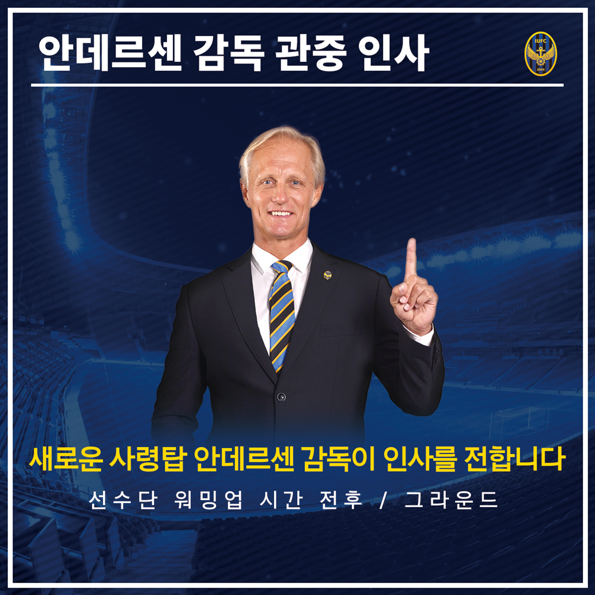 인천유나이티드 제 8대 사령탑으로 부임하게 된 욘 안데르센 감독이 경기 전 팬 여러분들께 인사를 전합니다. 선수단 워밍업 전후하여 안데르센 감독이 그라운드에 나서 인천 팬 대표로 구명준님 가족 분들께 환영의 꽃다발을 전달 받은 다음 직접 마이크를 들고 인천 팬 여러분들께 인사를 전할 예정입니다. 뜨거운 환영의 박수로 안데르센 감독을 맞이해주시기 바랍니다.
