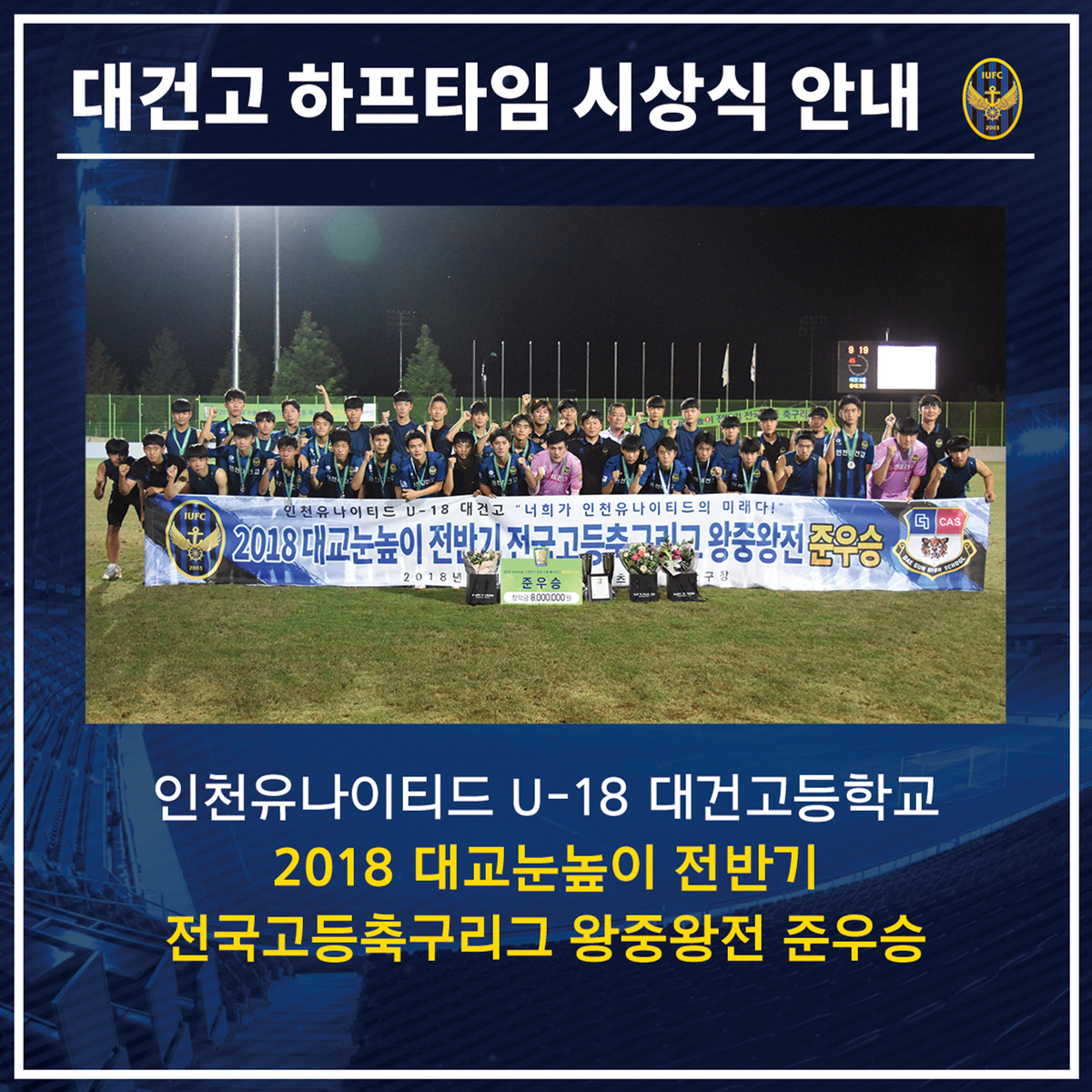 이날 홈경기 하프타임에는 ‘2018 대교눈높이 전반기 전국고등축구리그 왕중왕전’ 준우승 입상에 성공한 인천 대건고 선수단의 시상식이 진행됩니다. 뜨거운 축하의 박수를 부탁드립니다-!