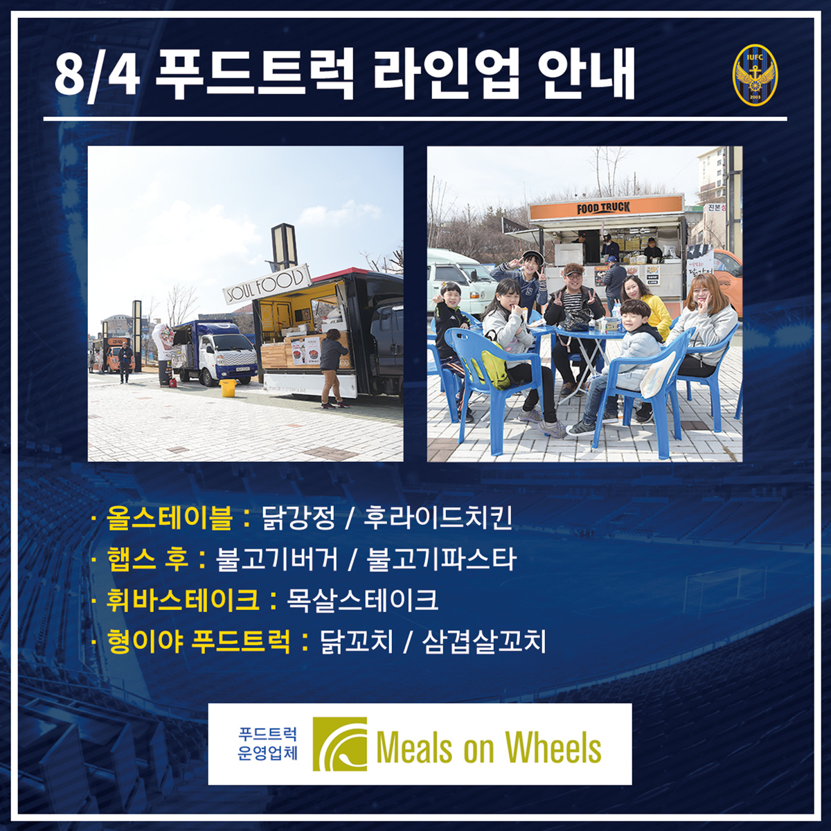 인천유나이티드 팬들의 입을 즐겁게 해주는 푸드트럭! 2018시즌에는 ‘밀스온휠스’와 함께 힘찬 출항에 나섰습니다. 이번 경기에 준비되는 푸드트럭의 메뉴 및 가격은 아래를 참고해주세요!