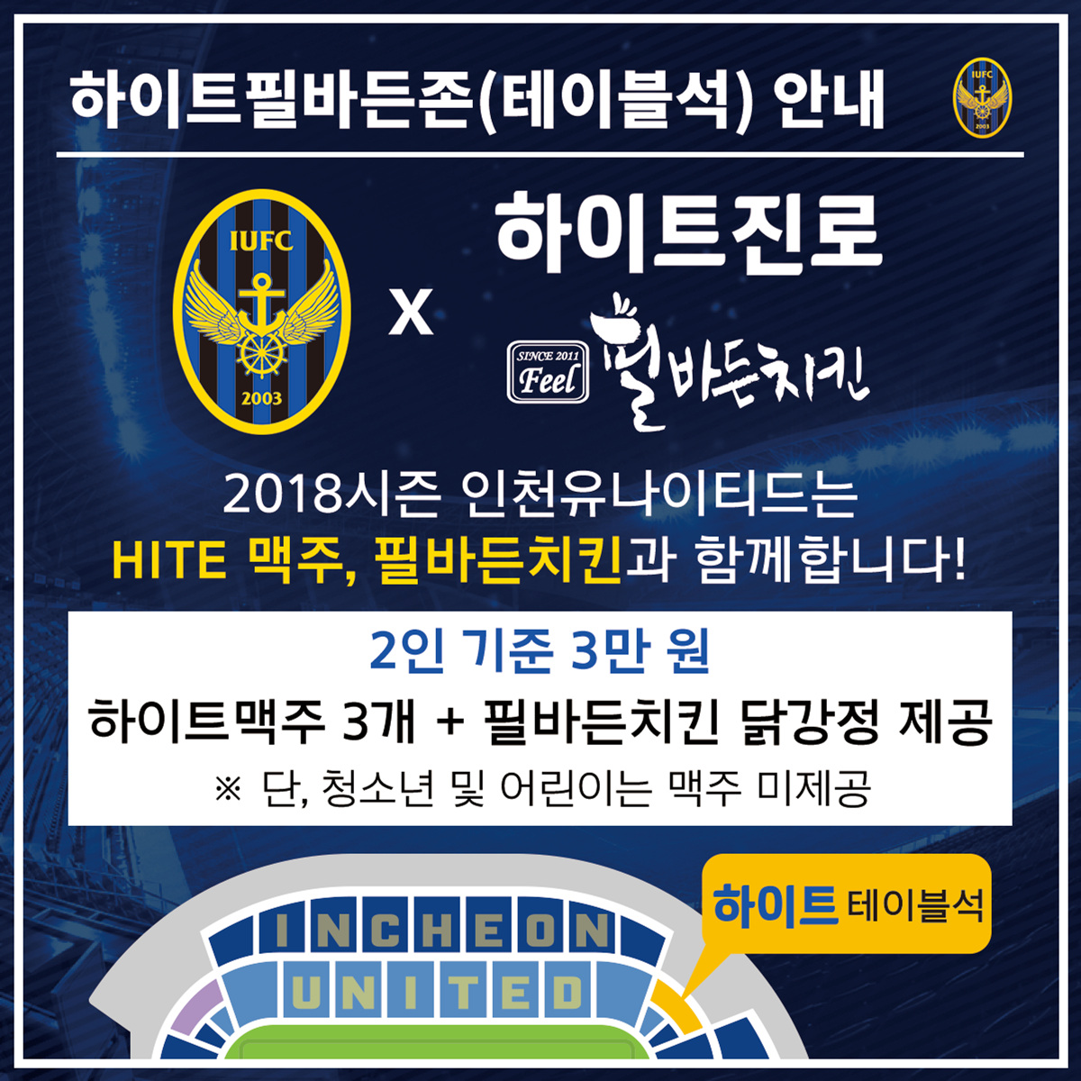 올 시즌 우리 인천유나이티드는 하이트맥주, 필바든치킨과 함께합니다. 이에 따라 기존 볼메존으로 운영되었던 E석과 S석 사이 코너에 위치한 테이블석이 ‘하이트필바든존’으로 운영됩니다.