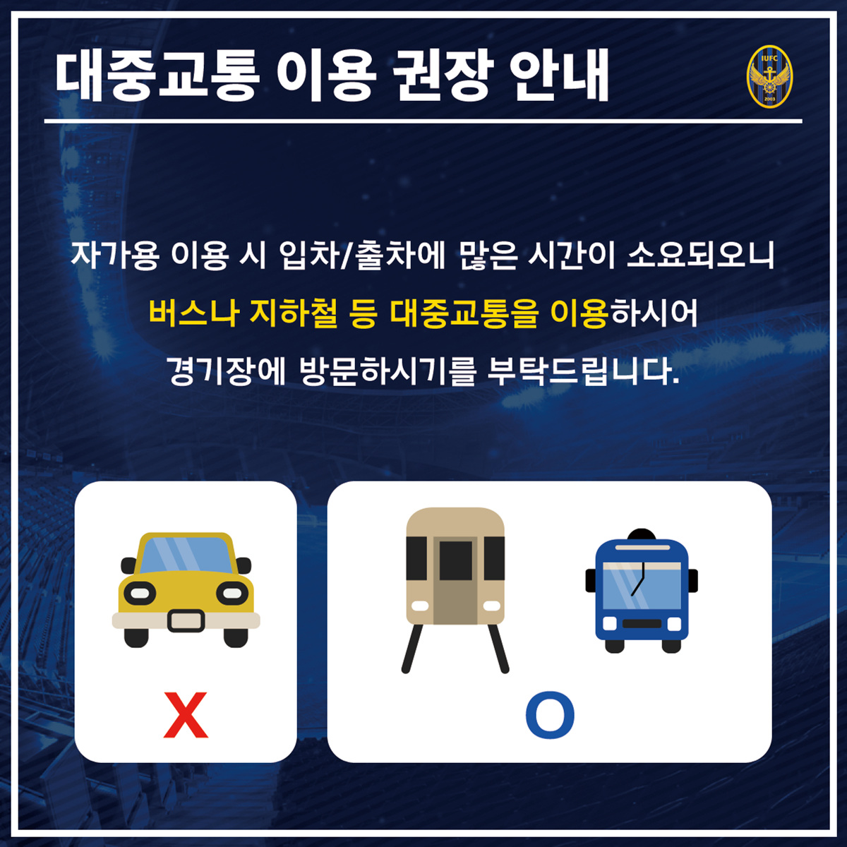 대중교통을 이용한 홈경기 방문을 권장합니다! 우리 인천유나이티드의 홈구장 인천축구전용경기장은 국철 도원역, 수인선 숭의역에서 각각 하차하시면 됩니다. 교통체증 방지 그리고 환경오염 방지를 위해 팬 여러분의 대중교통 이용을 다시 한 번 부탁드리겠습니다. 감사합니다.