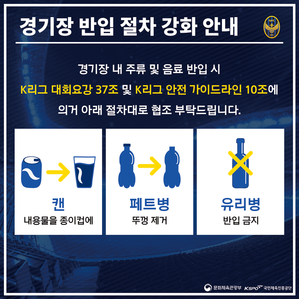 K리그 대회요강 37조 및 안전가이드 라인 10조와 13조에 의거하여 우리 구단은 홈경기 당일 경기장 물품 반입 절차 및 매점 판매 물품에 대한 관리 감독을 철저하게 진행하고 있습니다.