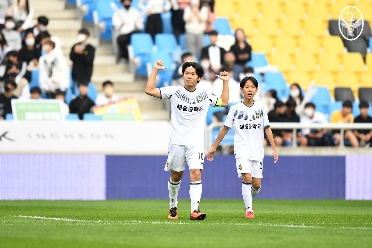 전민욱 지도교사가 이끄는 인천 해송중학교는 16일 인천축구전용경기장에서 펼쳐진 'SK텔레콤 인천유나이티드 미들스타리그 2022' 결승전에서 인천 계수중학교를 1-0 으로 꺾고 대회 첫 우승을 차지했다. 승부의 향방은 후반 막판에 갈렸다. 후반 22분 이날 최전방 공격수로 선발 출전한 황승민이 자신이 만들어낸 페널티킥을 직접 마무리하며 골을 기록했다. 결국 이 득점이 결승골이 됐다.