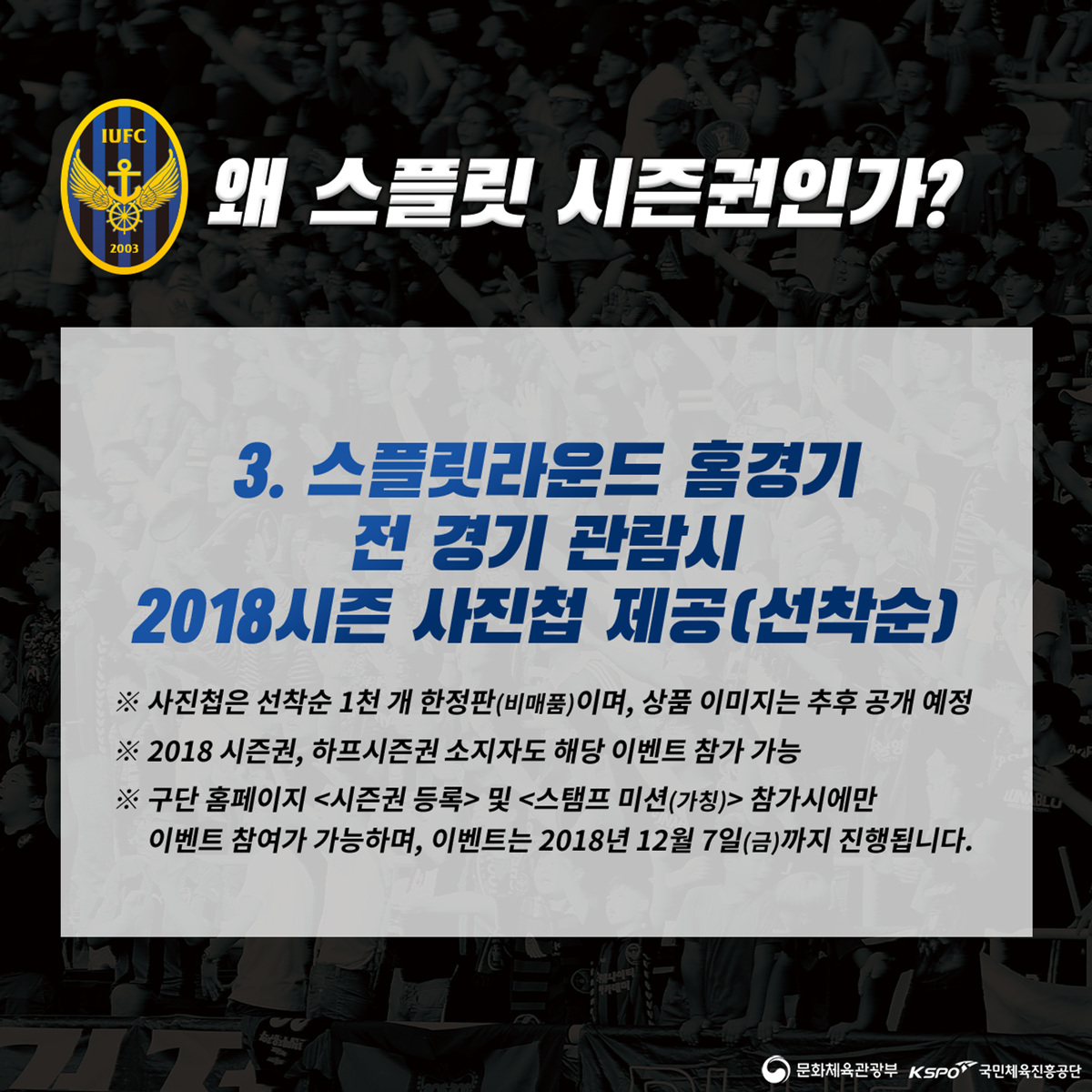 아울러 올 시즌 스플릿 홈경기(3경기 예정) 모두를 관람하신 시즌권 회원(연간 시즌권, 하프 시즌권, 스플릿 시즌권 모두 해당) 중 선착순 1,000명에게는 연말에 구단 사진집을 선물로 제공할 예정입니다. <단, 구단 홈페이지를 통해 시즌권 실사용자 등록을 마친 자에 한함>