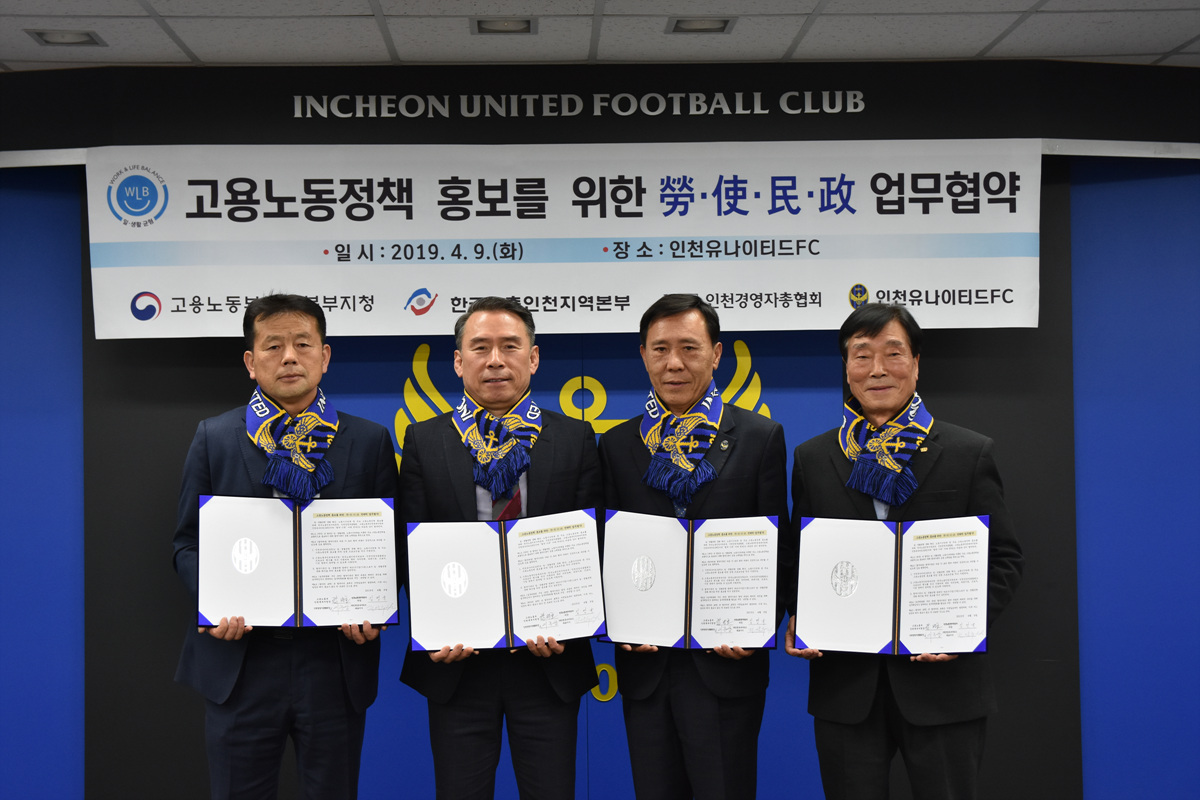 인천유나이티드가 고용노동부인천북부지청, 인천경영자총협회, 한국노총인천지역본부와 업무 협약을 맺었다.