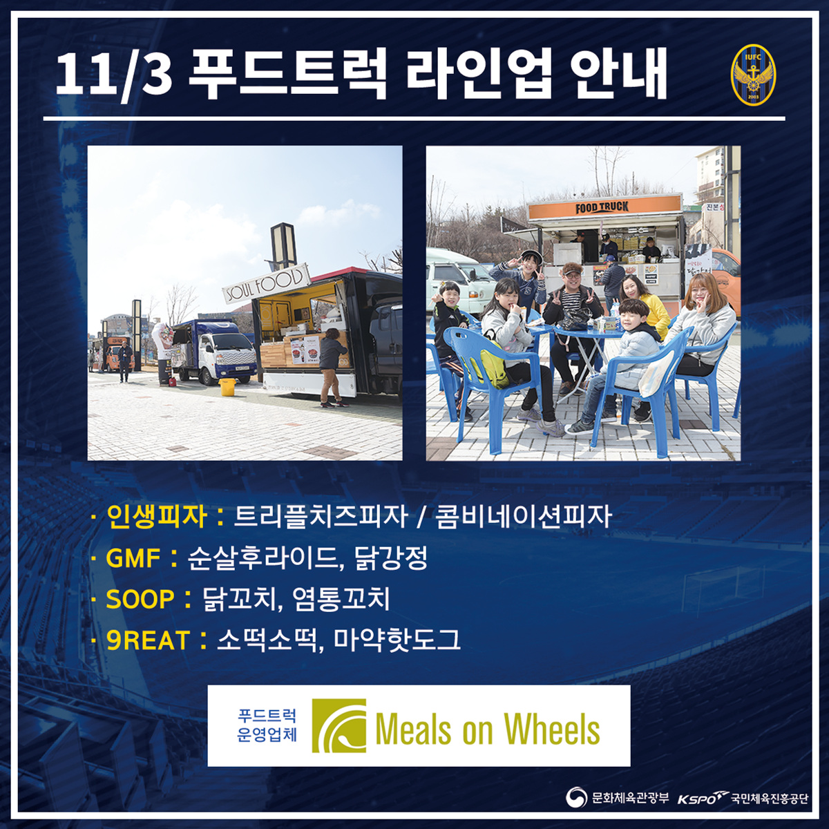 인천유나이티드 팬들의 입을 즐겁게 해주는 푸드트럭! 2018시즌에는 ‘밀스온휠스’와 함께 힘찬 출항에 나섰습니다. 이번 경기에 준비되는 푸드트럭의 메뉴 및 가격은 아래를 참고해주세요!