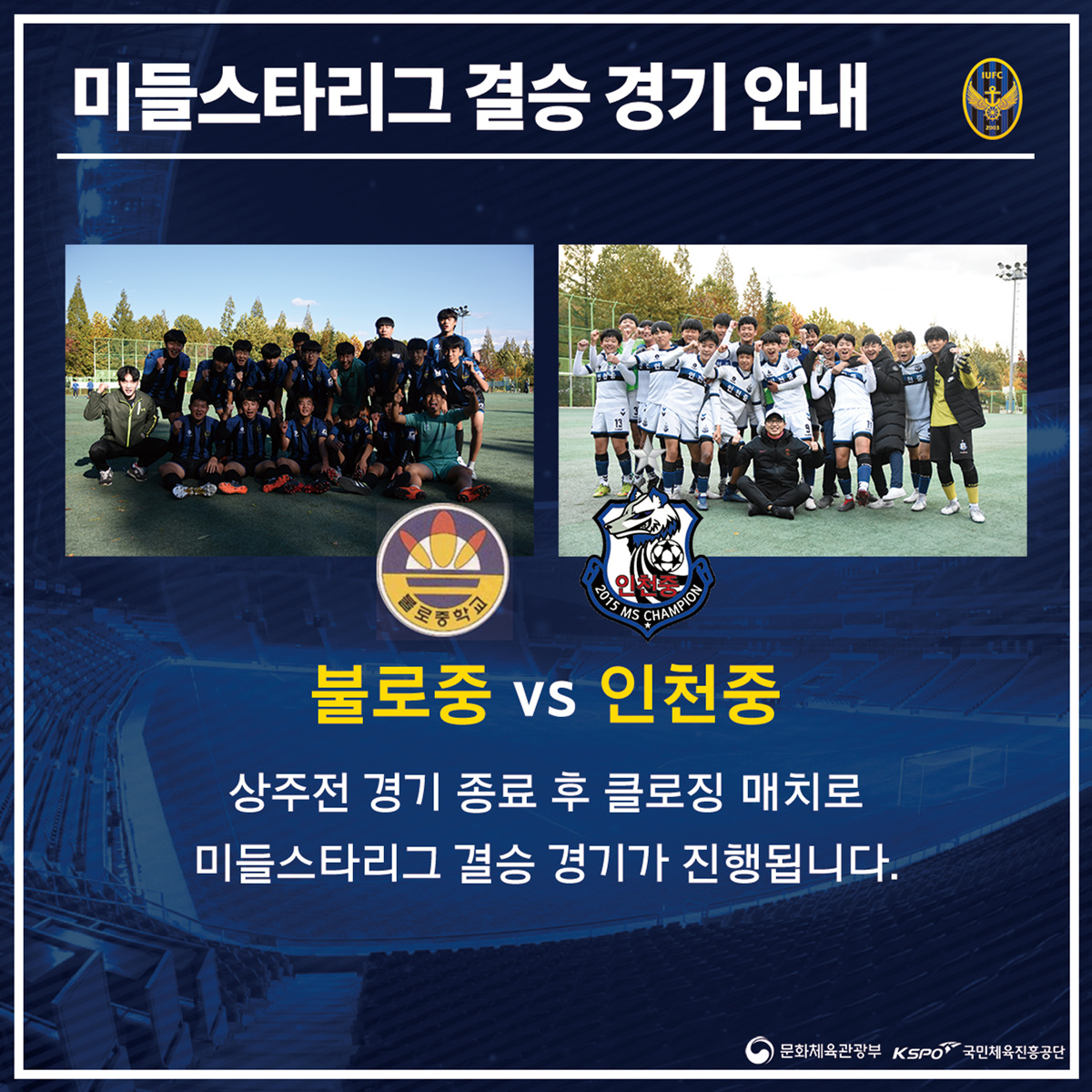 상주전 홈경기 종료 후 ‘인천유나이티드 미들스타리그 2018’ 결승전이 클로징 매치로 진행됩니다. 사상 첫 우승에 도전하는 불로중과 통산 2번째 우승에 도전하는 인천중의 피할 수 없는 맞대결!!! 인천 팬 여러분의 많은 관심과 관람을 부탁드립니다.