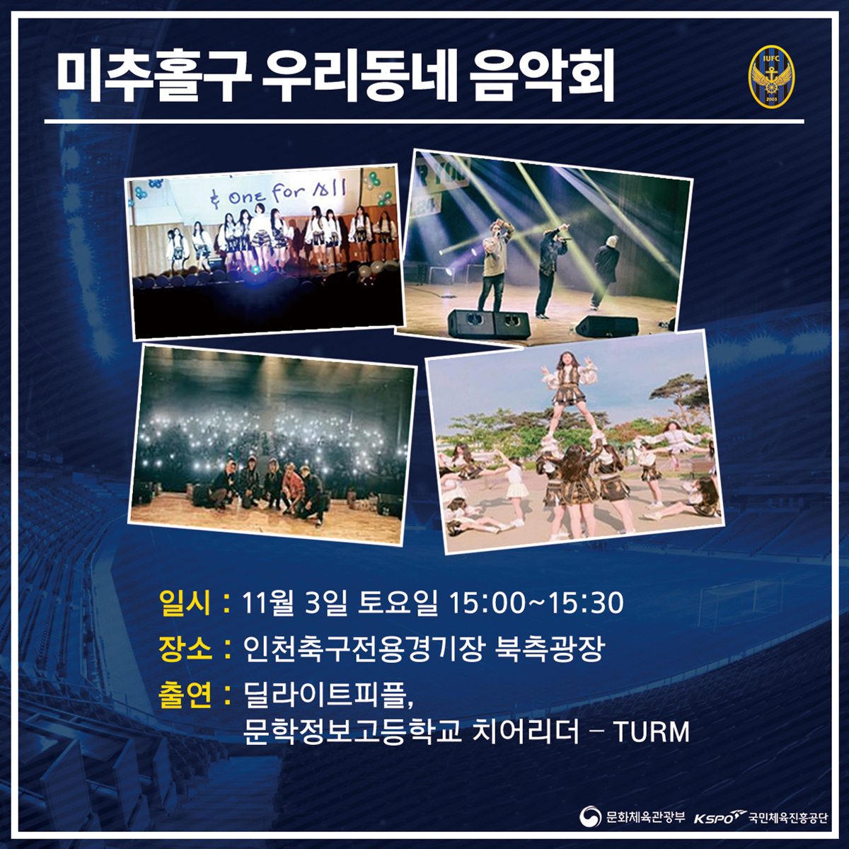 이번 상주전 홈경기 당일 경기장 북측광장에서는 인천미추홀구청에서 주관하는 ‘미추홀구 우리동네 음악회’ 행사가 진행됩니다. 이번 행사는 축구 관람을 위해 경기장을 찾은 팬들이 인천의 승리를 응원하기에 앞서 흥을 돋구기 위해 마련됐습니다. 크나 큰 관심을 부탁드립니다.