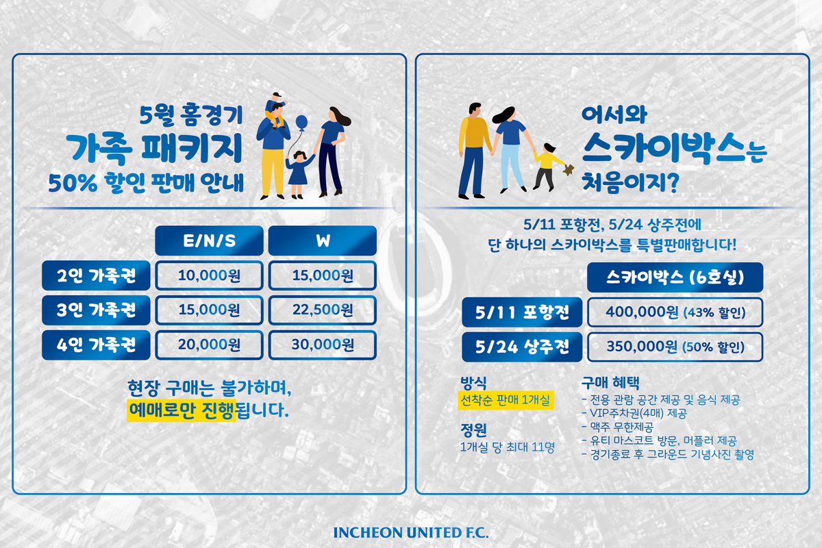 인천유나이티드가 5월 가정의 달을 맞이해 ‘가족 패키지’와 ‘스카이박스’ 패키지를 특별 할인가에 판매한다.