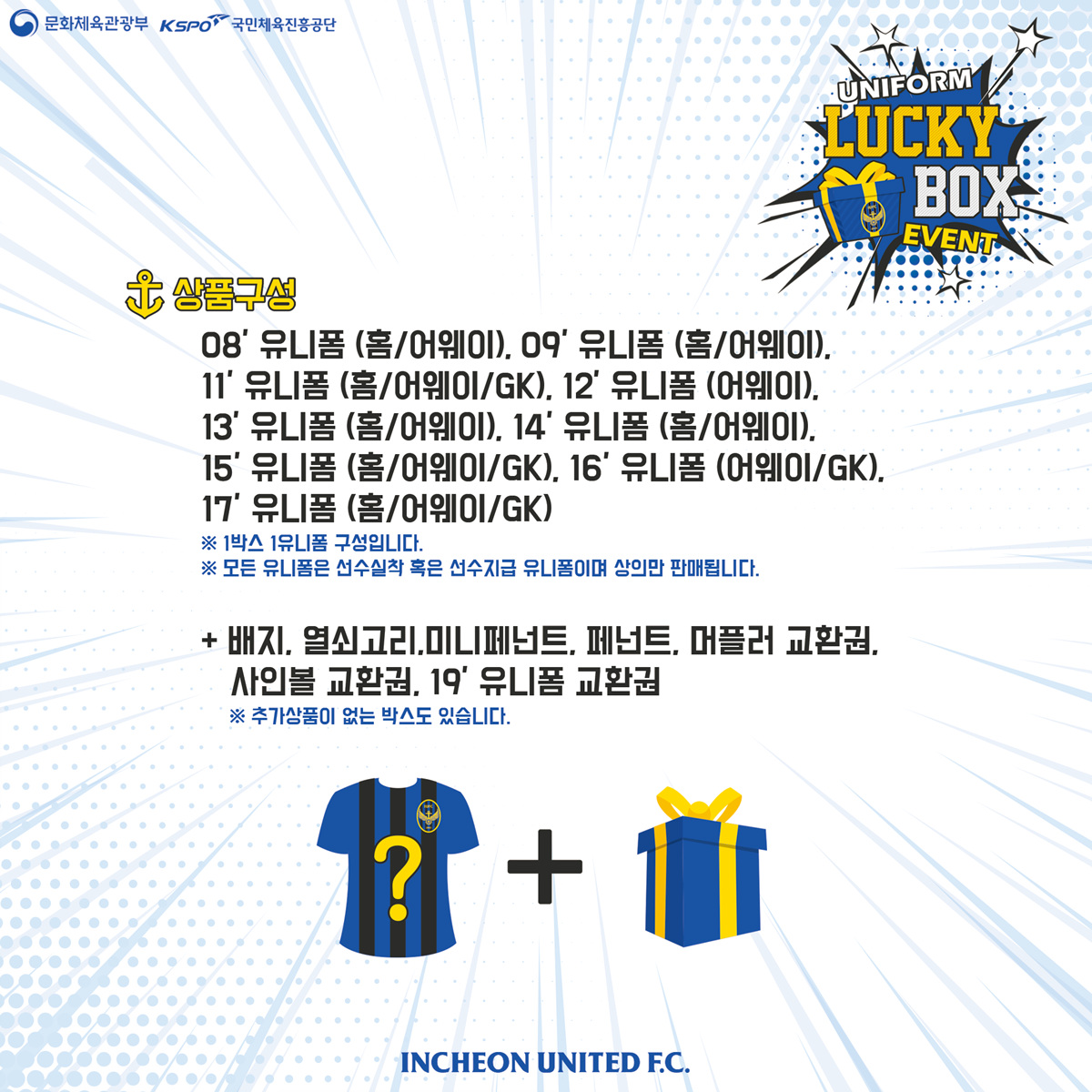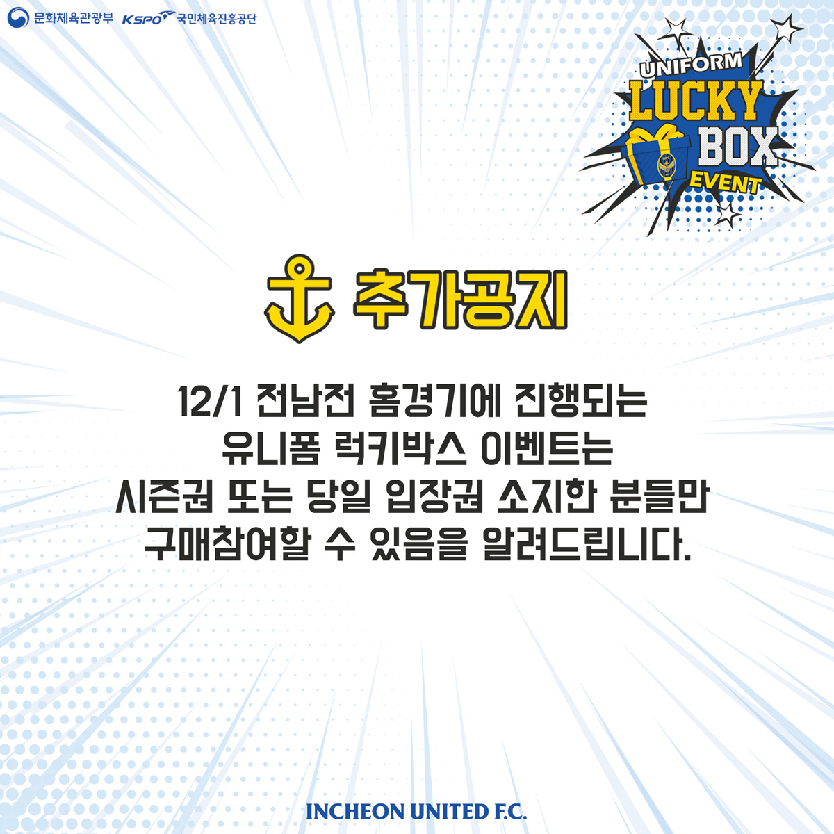 안녕하세요, 인천유나이티드입니다. 12/1 전남전 홈경기에 유니폼 럭키박스 이벤트를 진행합니다.