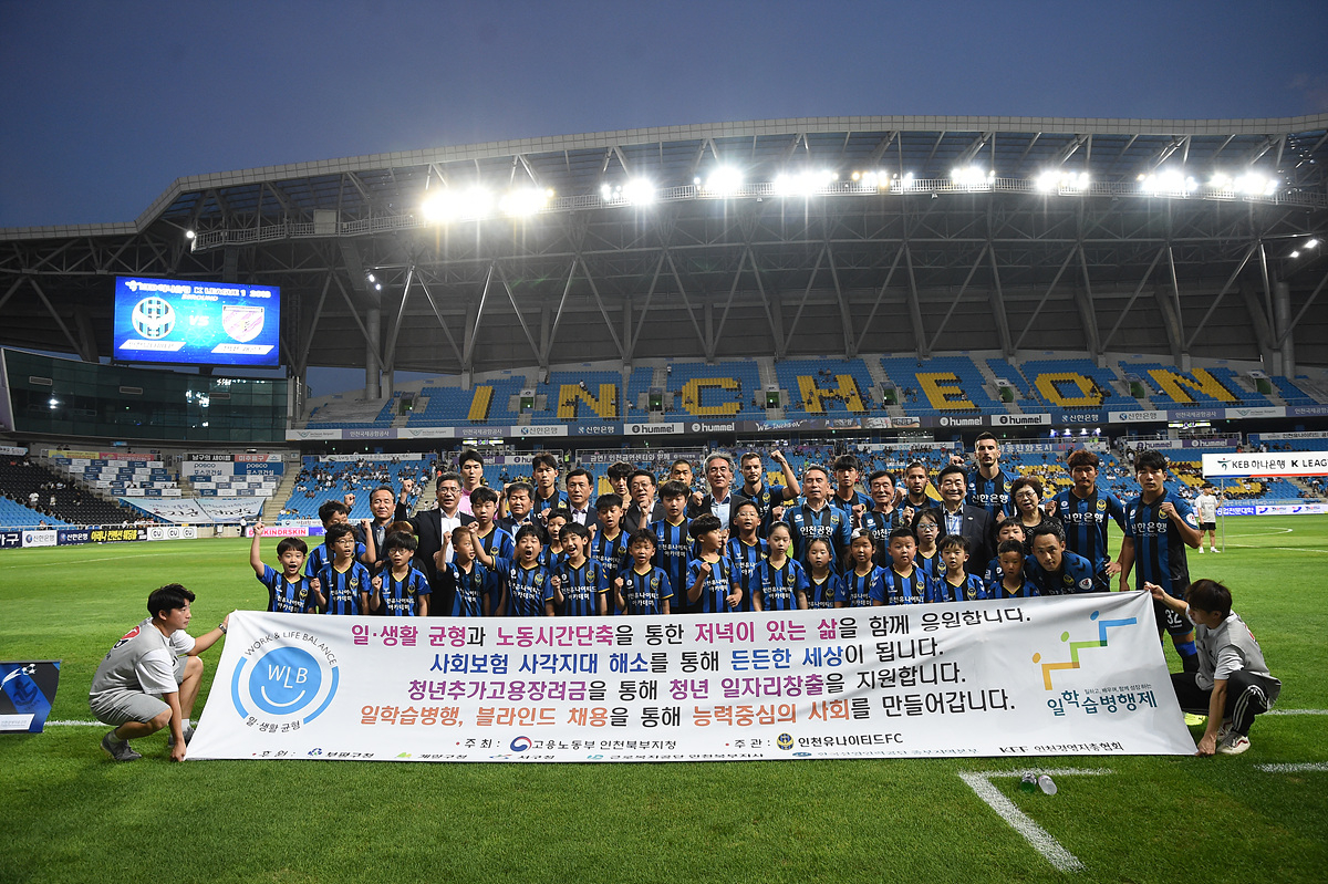 특히 이번 수원전 홈경기는 MOU 기관인 고용노동부 인천북부지청과 함께 ‘워라밸(Work & Life Balance)데이’로 진행된다. 고용노동부 인천북부지청은 작년에 이어 올해도 인천유나이티드 팬들을 찾아 일과 생활의 균형과 노동시간 단축을 통해 저녁 있는 삶을 제창하며 막대 풍선 등의 기념품을 제공할 예정이다.