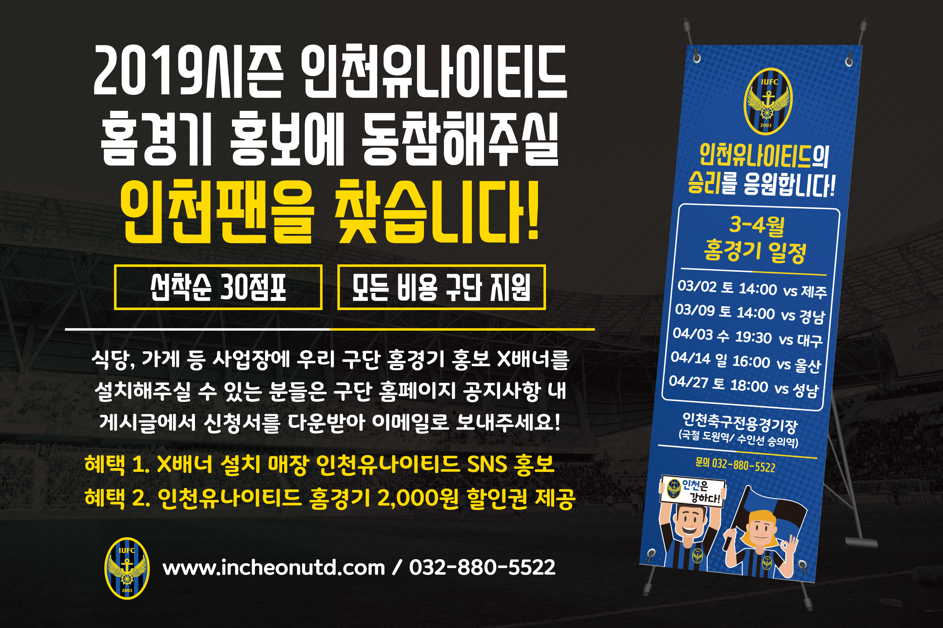 식당, 가게 등 개인 사업장에 2019시즌 인천유나이티드 홈경기 홍보 X배너 및 홈경기 일정 액자 설치, 홈경기 일정 명함 비치 등을 통해 연중으로 홈경기 홍보에 동참해주실 의향이 있으신 분들은 본 게시글 하단에 첨부된 신청서를 다운받아 작성해 구단 이메일로 보내주세요! (선착순 30점포 모집)