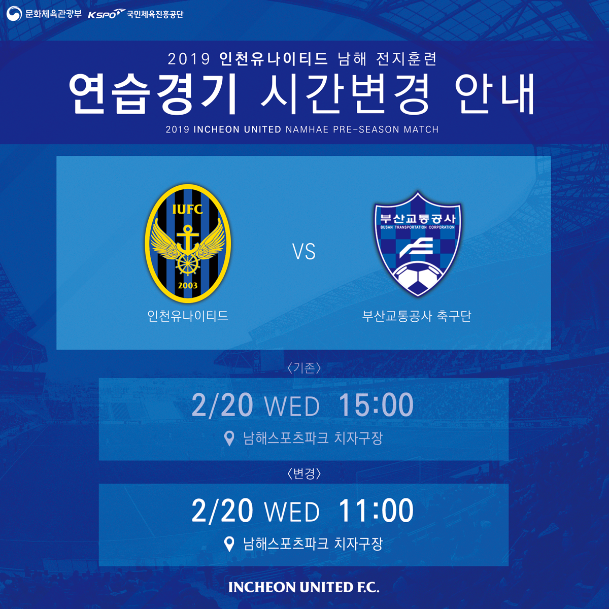 안녕하세요, 인천유나이티드입니다. 2월 20일 수요일 오후 3시 남해스포츠파크 치자구장에서 진행 예정이었던 부산교통공사 축구단과 연습경기 시간이 변경되어 안내드립니다.