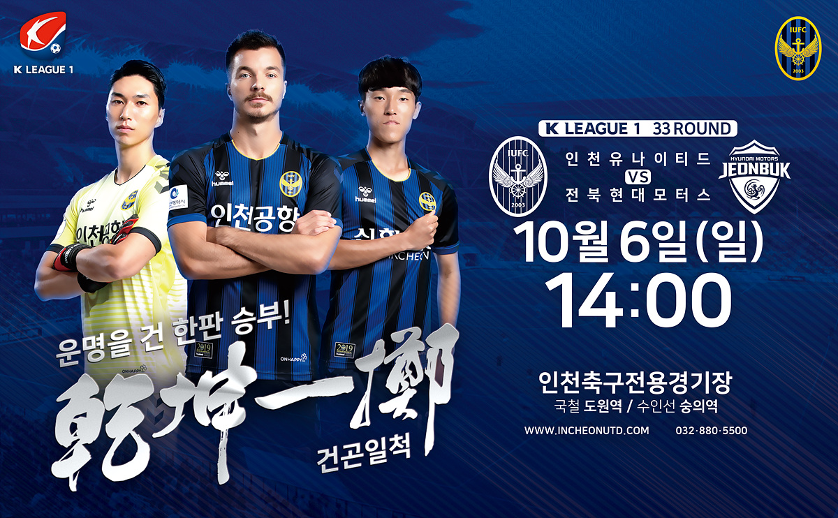 인천은 다가오는 6일 오후 2시 인천축구전용경기장에서 전북현대와 ‘하나원큐 K리그 1 2019’ 33라운드 정규리그 마지막 홈경기를 치른다.