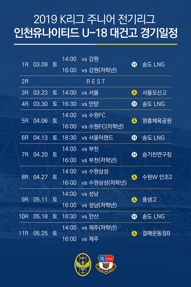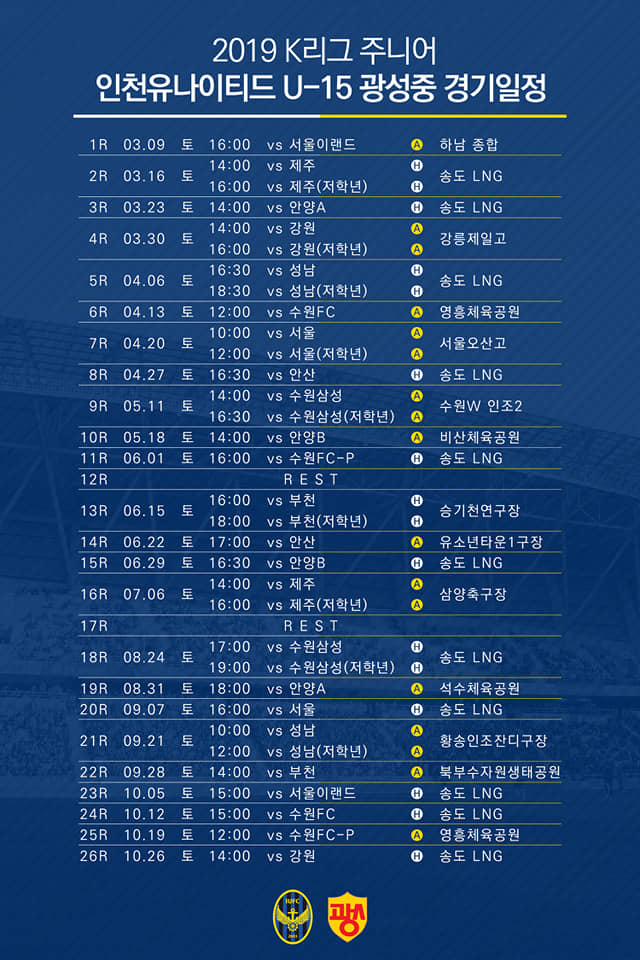 안녕하세요, 인천유나이티드입니다. 오늘(3/9)부터 K리그 주니어 일정이 시작됩니다. U-18 리그는 평소와 같이 전/후기리그를 진행하며 올해부터 새롭게 출범된 U-15 리그는 전/후기 구분 없이 풀리그로 진행될 예정입니다.