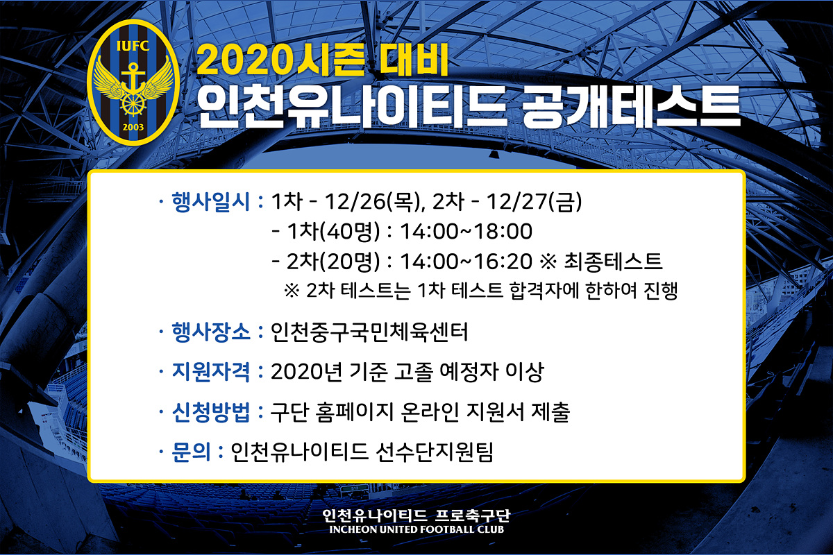 지원자격은 2020년 기준 고졸 예정자 이상이면 누구나 참가 신청할 수 있다. 참가신청서와 함께 경기실적증명서(2018-2019)를 제출하면 된다. 그밖에 자세한 사항은 인천 구단 홈페이지 공지사항을 참고하면 된다.INCHEON UNITEDMEDIA FEEDS