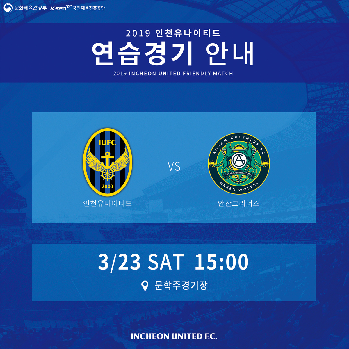 안녕하세요, 인천유나이티드입니다. 3월 23일 토요일 오후 3시 문학주경기장에서 안산그리너스와의 연습경기가 진행되어 안내 말씀을 드립니다.