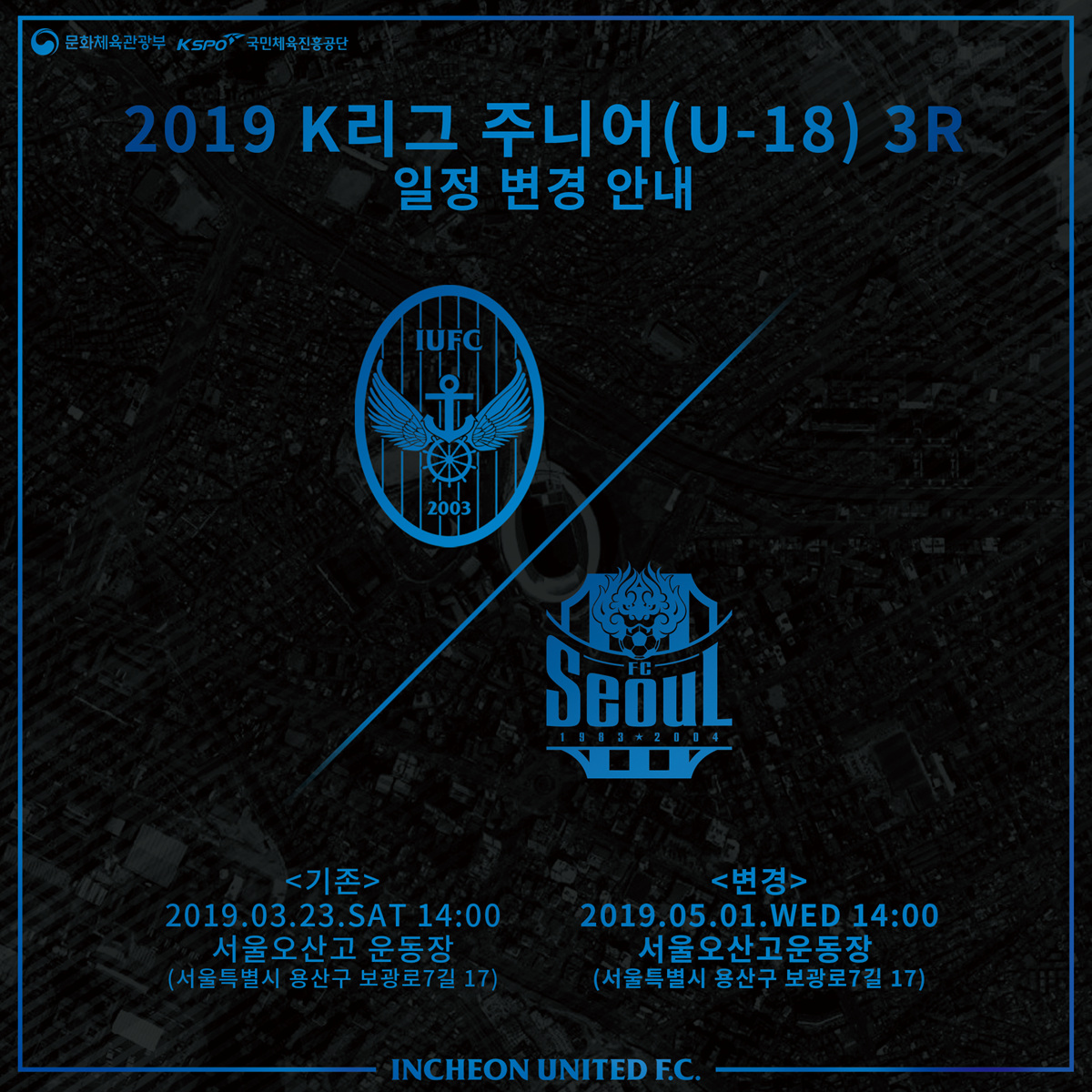 안녕하세요, 인천유나이티드입니다. ‘2019 아디다스 K리그 주니어(U-18)’ 3라운드 인천 대건고와 서울 오산고의 경기 일정이 변경되었습니다.