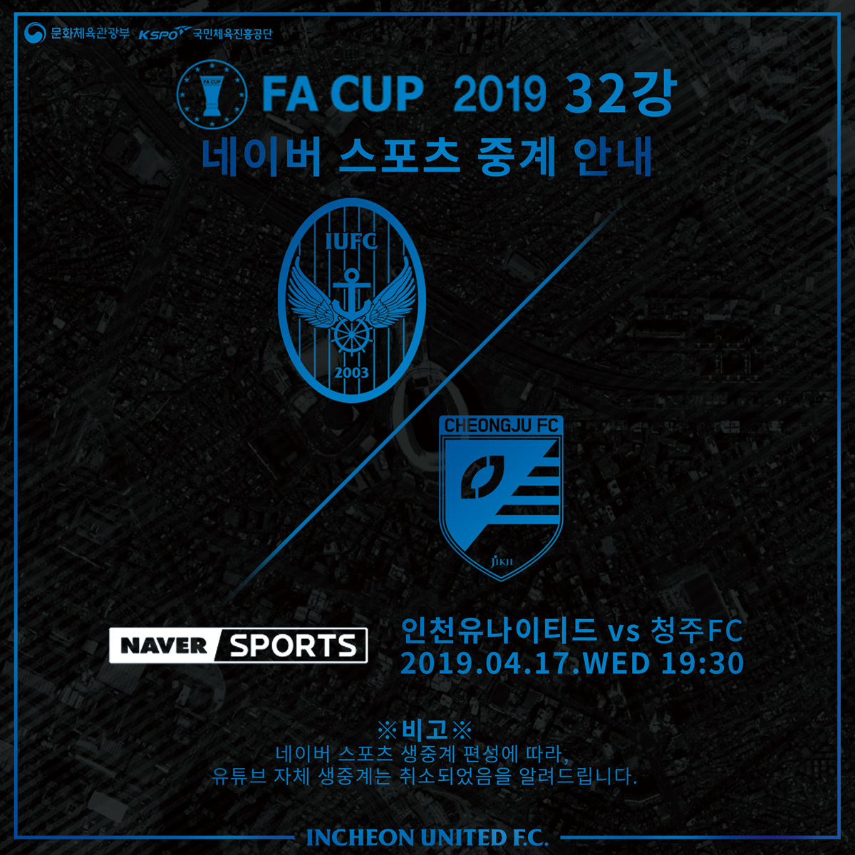 Hello, This is Incheon United Football Club. On April 17 Wednesday, at 7:30 PM, there will be a FA cup round of 32 match against Cheongju FC at Incheon Football Stadium. Please note that the club’s own broadcast on Youtube has been cancelled as Naver is live-broadcasting the match. Thank you.