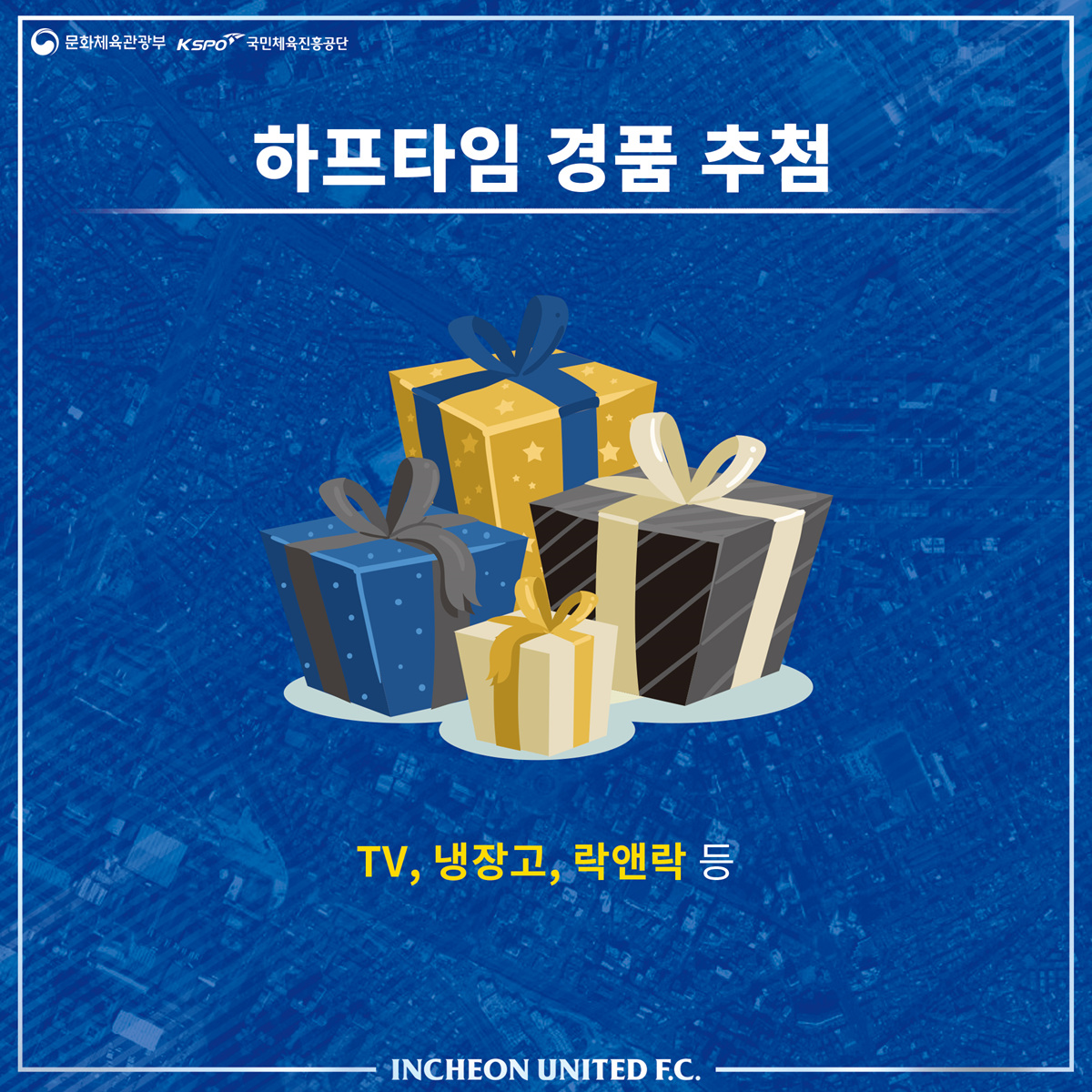 “행운의 주인공이 되어 보세요!” 성남전 홈경기 관람객을 대상으로 한 특별 이벤트! 추첨을 통해 TV, 냉장고, 락앤락 등 경품을 제공합니다. 인천 팬 여러분의 관심을 부탁드립니다.