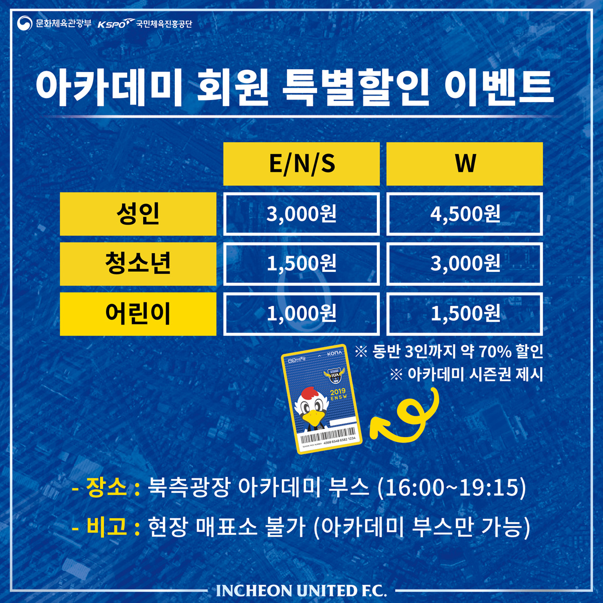 이번 성남전 홈경기는 ‘인천유나이티드 아카데미의 날’로 진행됩니다. 아카데미 회원 가족 분들께서는 북측광장에 설치된 아카데미 부스에 방문하시어 아카데미 시즌권을 제시하시면 할인된 가격에 입장권을 구입하실 수 있습니다. 가격 등 내용은 이미지를 참고해주시기 바랍니다.