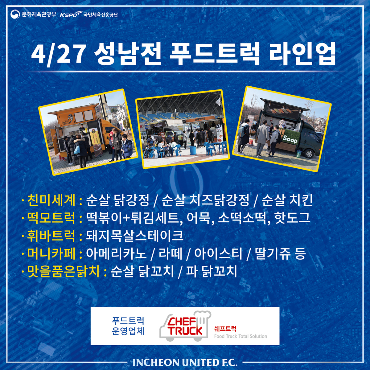 인천유나이티드 팬들의 입을 즐겁게 해주는 푸드트럭! 2019시즌에는 ‘쉐프트럭’과 함께 힘찬 출항에 나섰습니다. 이번 경기에 준비되는 푸드트럭의 메뉴 및 가격은 아래를 참고해주세요!