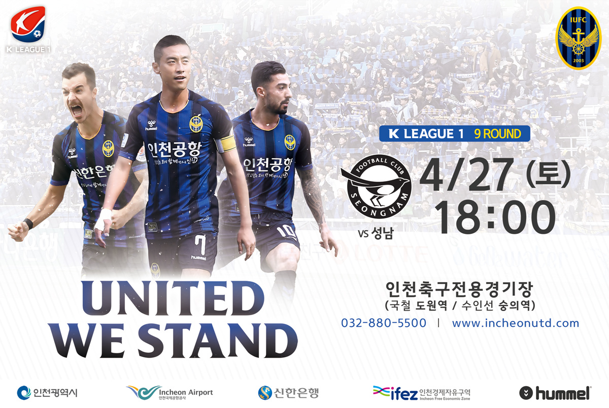 “연패 탈출 성공, 이제는 시즌 2승 신고 도전!”4/27(토) 오후 6시. 우리 인천유나이티드가 성남FC를 상대로 올 시즌 5번째 홈경기를 치릅니다. 인천 팬 여러분, 경기장에 많이 찾아오시어 인천의 승리를 다함께 힘차게 외쳐주세요!