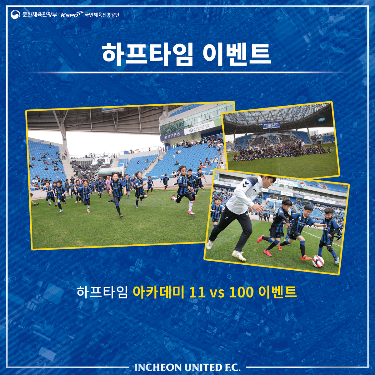 ‘인천유나이티드 아카데미의 날’을 기념하여 하프타임 11대 100 이벤트 매치가 진행됩니다. 프로선수 11명과 아카데미 어린이 100명이 함께 즐기는 이벤트 매치를 즐겨보시기 바랍니다.