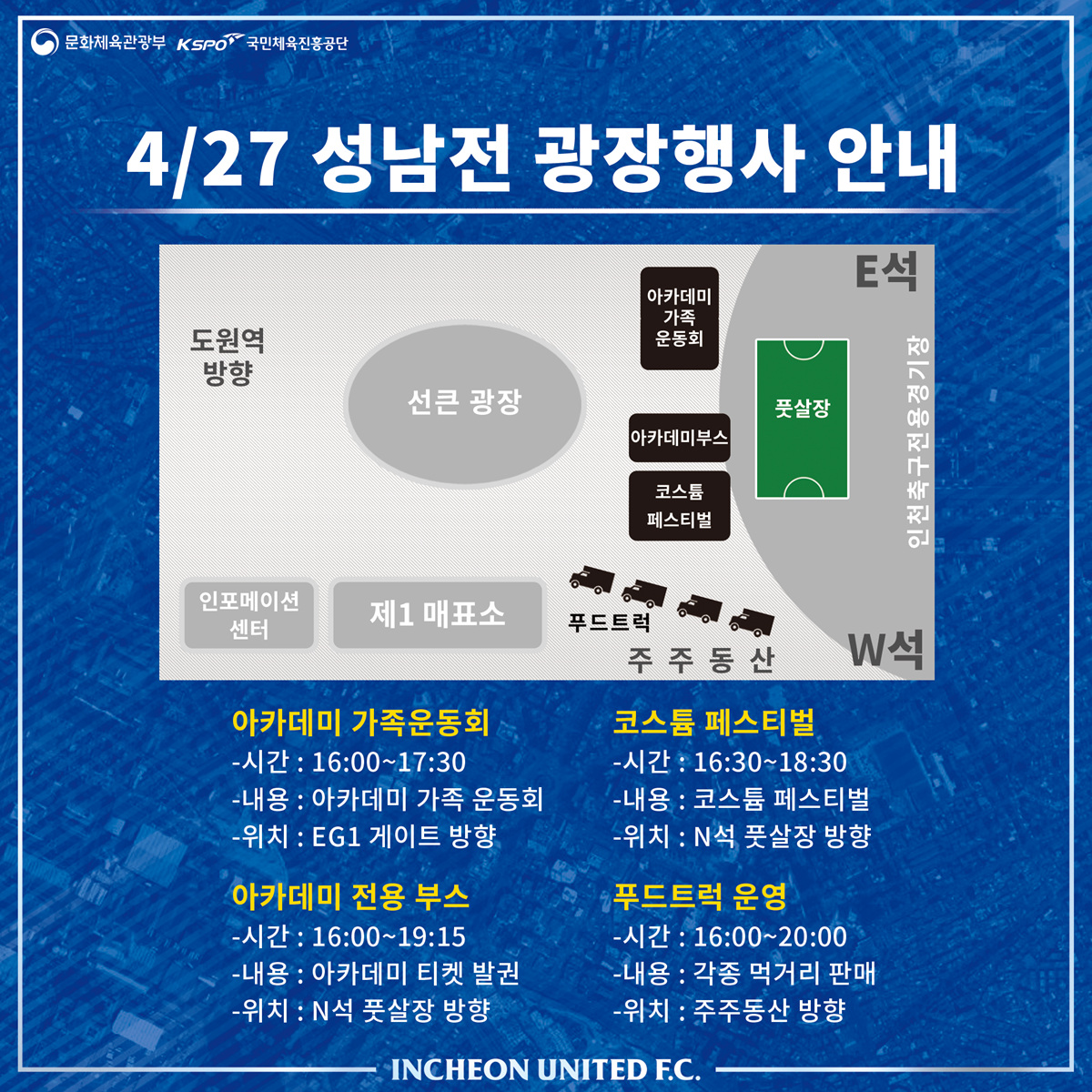 이번 성남전 홈경기 북측 광장에서는 푸드트럭과 함께 아카데미 가족 운동회, 코스튬 테스티벌 등의 이벤트가 운영됩니다. 자세한 내용은 이미지를 통해 확인해주시길 부탁드리겠습니다.