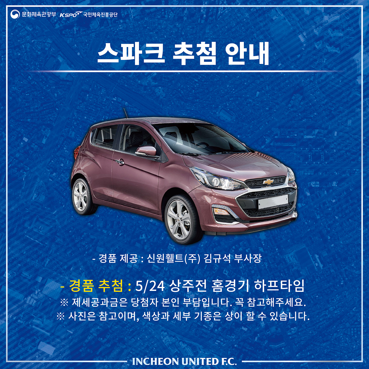 “행운의 주인공이 되어 보세요!” 상주전 홈경기 관람객을 대상으로 한 특별 이벤트! 추첨을 통해 신원휄트㈜ 김규석 부사장께서 후원한 쉐보레 스파크 경품을 제공합니다. 이뿐만 아니라 식전 퀴즈이벤트, ‘터치플레이’와 함께하는 하프타임 이벤트 등도 진행됩니다. 인천 팬 여러분의 뜨거운 관심 부탁드립니다. 감사합니다.