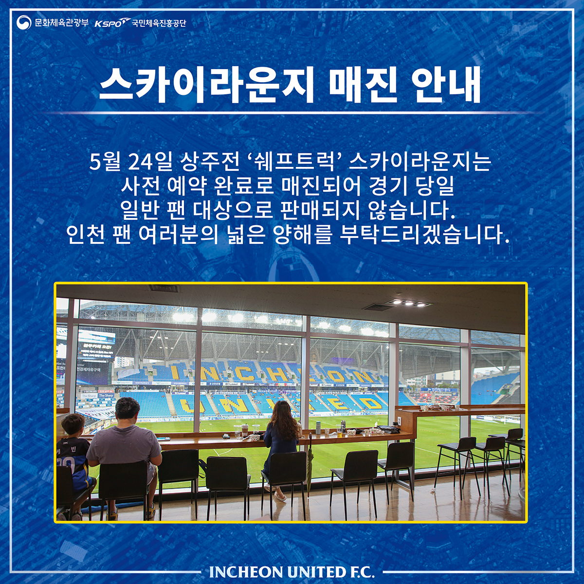 이번 상주전 홈경기의 경우 사전 예약 완료로 매진되어 경기 당일 일반 팬 대상으로 판매되지 않습니다. 인천 팬 여러분의 넓은 양해를 부탁드리겠습니다. 감사합니다.