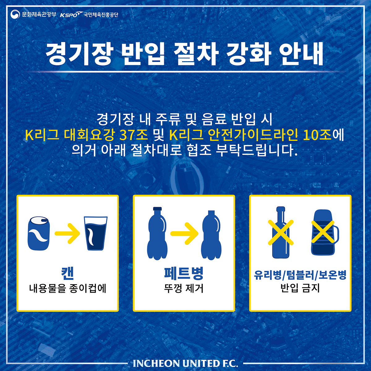 K리그 대회요강 37조 및 안전가이드 라인 10조와 13조에 의거하여 우리 구단은 홈경기 당일 경기장 물품 반입 절차 및 매점 판매 물품에 대한 관리 감독을 철저하게 진행하고 있습니다.