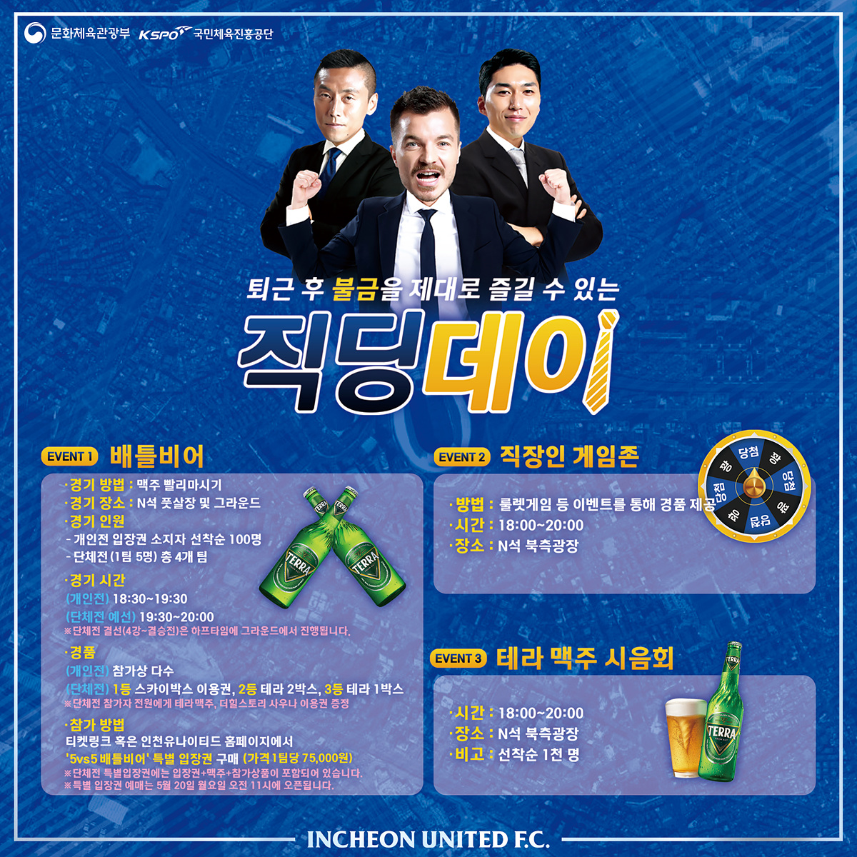 이번 상주전은 인천유나이티드의 첫 ‘프라이데이 나이트 풋볼(Friday Night Football)’ 홈경기를 기념하여 직장인들을 위한 ‘직딩데이’가 개최됩니다. 북측 광장과 풋살장 일대에서 맥주 빨리 마시기 대회, 맥주 시음회, 룰렛게임 등의 이벤트가 운영됩니다. 한 주간 수고하신 직장인 팬분들은 인천축구전용경기장으로 오셔서 이벤트 참가도 하고, 축구도 관람하면서 ‘불금’을 마음껏 즐기세요! 자세한 내용은 이미지를 참고해주시길 바랍니다.