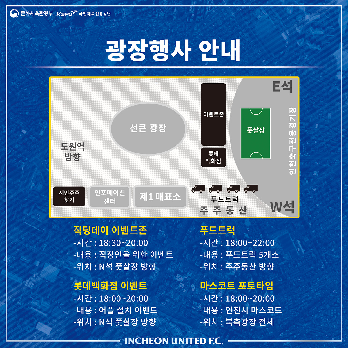 “나의사랑 인천FC~♬” 경기 전 안영민 장내아나운서와 함께 인천의 승리를 응원하는 시간-! 응원배우기 이벤트를 통해 홀리데이 인 인천 송도호텔과, 파라다이스시티 씨메르 스파이용권, 더힐스토리 스파이용권, 월미테마파크 이용권 등의 경품을 제공합니다.