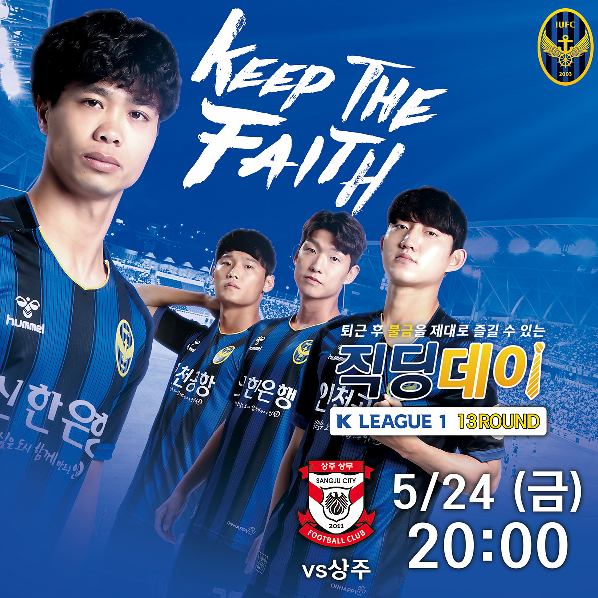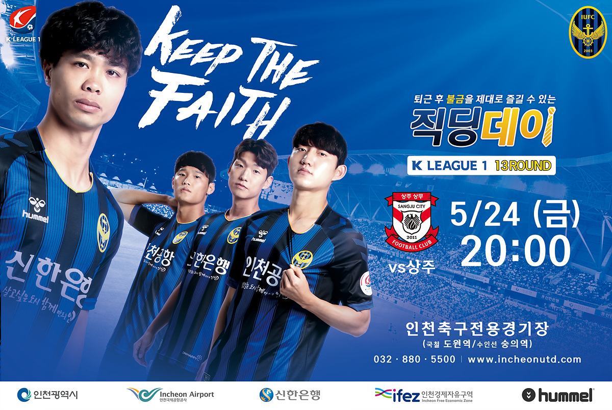 “유상철호 출항 후 첫 홈경기, 시즌 2승 도전!”5/24(금) 오후 8시. 우리 인천유나이티드가 상주상무를 상대로 올 시즌 7번째 홈경기를 치릅니다. 인천 팬 여러분, 이번시즌부터 첫선을 보이는 ‘프라이데이 나이트 풋볼’의 첫 홈경기에 많이 찾아오셔서 인천의 승리를 다함께 힘껏 응원해주세요!
