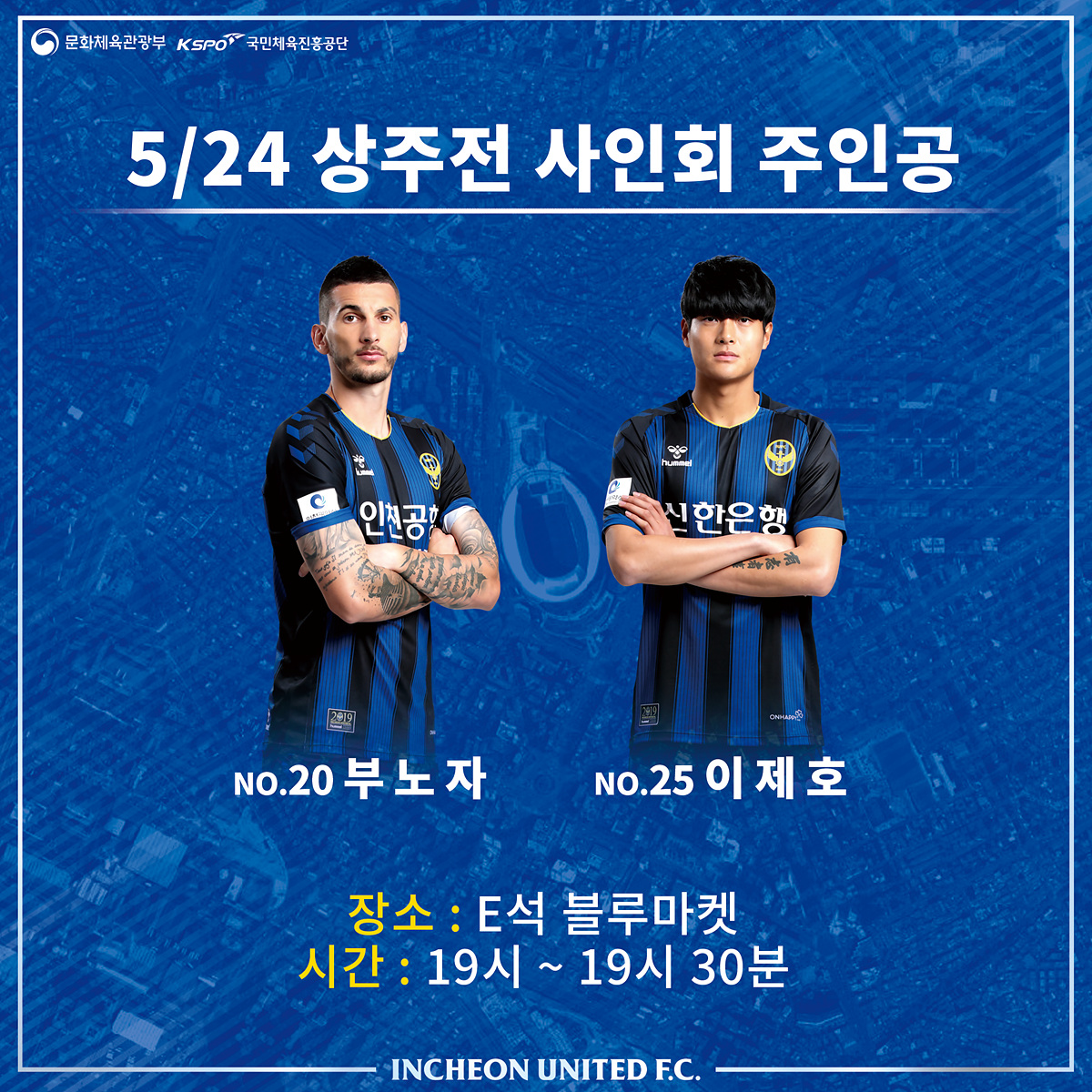 올 시즌에도 선수단 팬 사인회 행사가 이어집니다. 이번 홈경기 팬 사인회는 오후 7시부터 7시 30분까지 E석 블루카페에서 선착순으로 진행되며 이날 부노자, 이제호 선수가 팬사인회를 통해 팬 여러분을 만날 예정입니다. 인천 팬 여러분의 많은 관심을 부탁드리겠습니다.