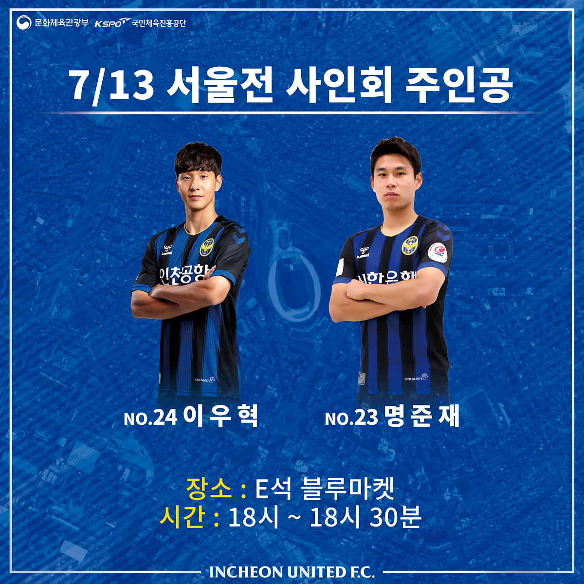 올 시즌에도 선수단 팬 사인회 행사가 이어집니다. 이번 홈경기 팬 사인회는 오후 6시부터 6시 30분까지 E석 블루카페에서 선착순으로 진행되며 팬 사인회에 참석하는 선수는 이우혁, 명준재 선수입니다! 인천 팬 여러분의 많은 관심 부탁드립니다.