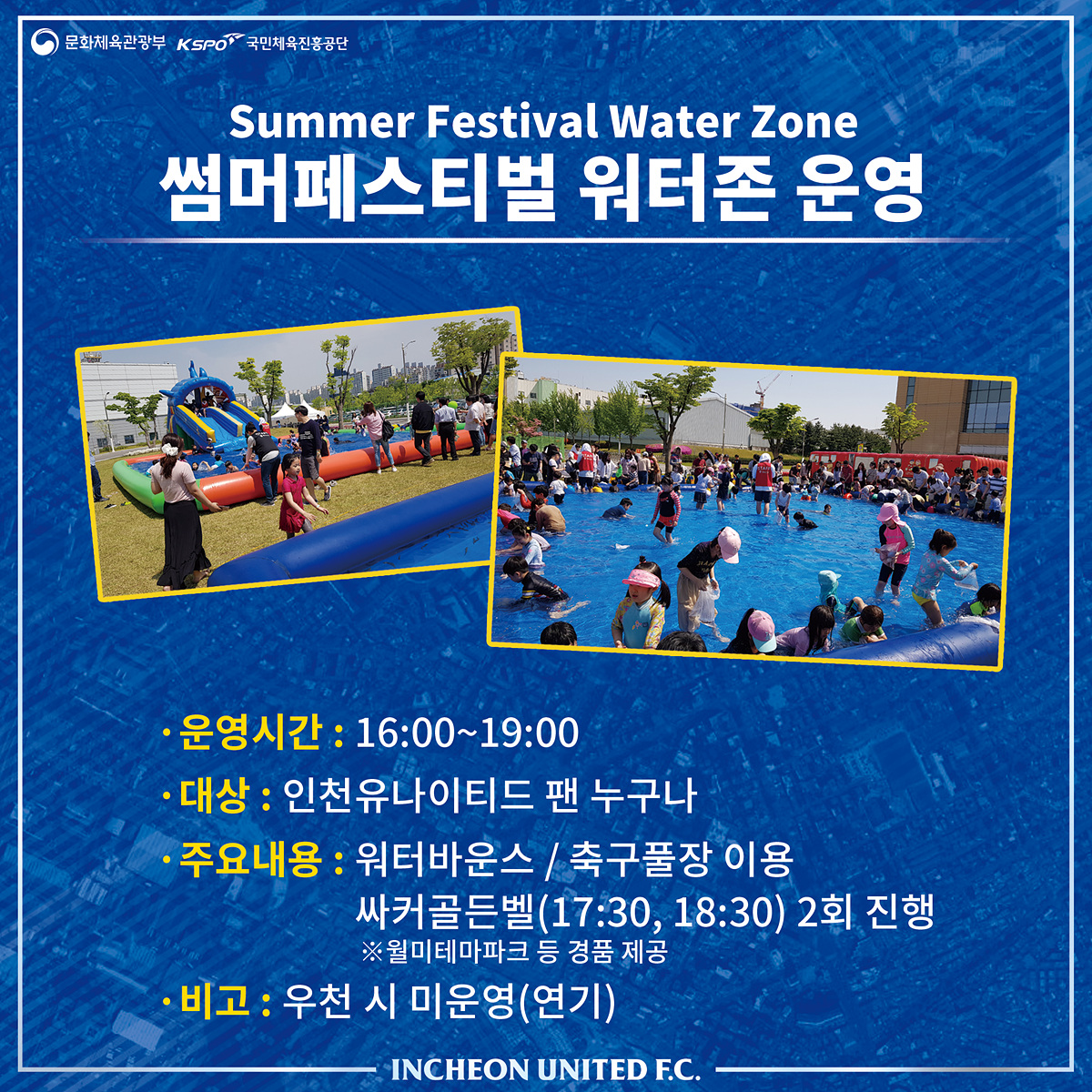 인천유나이티드는 이번 서울전 홈경기에 여름을 맞아 부모님과 아이들을 위한 신나는 물놀이 잔치를 준비했습니다. 이와 함께 가족이 모두 참여할 수 있는 축구퀴즈 골든벨로 월미테마파크 이용권 등의 경품을 받아가시길 바랍니다. 인천 시민이 다 함께 즐기는 축제 한 마당이 될 수 있도록 팬 여러분의 많은 관심을 부탁드립니다.