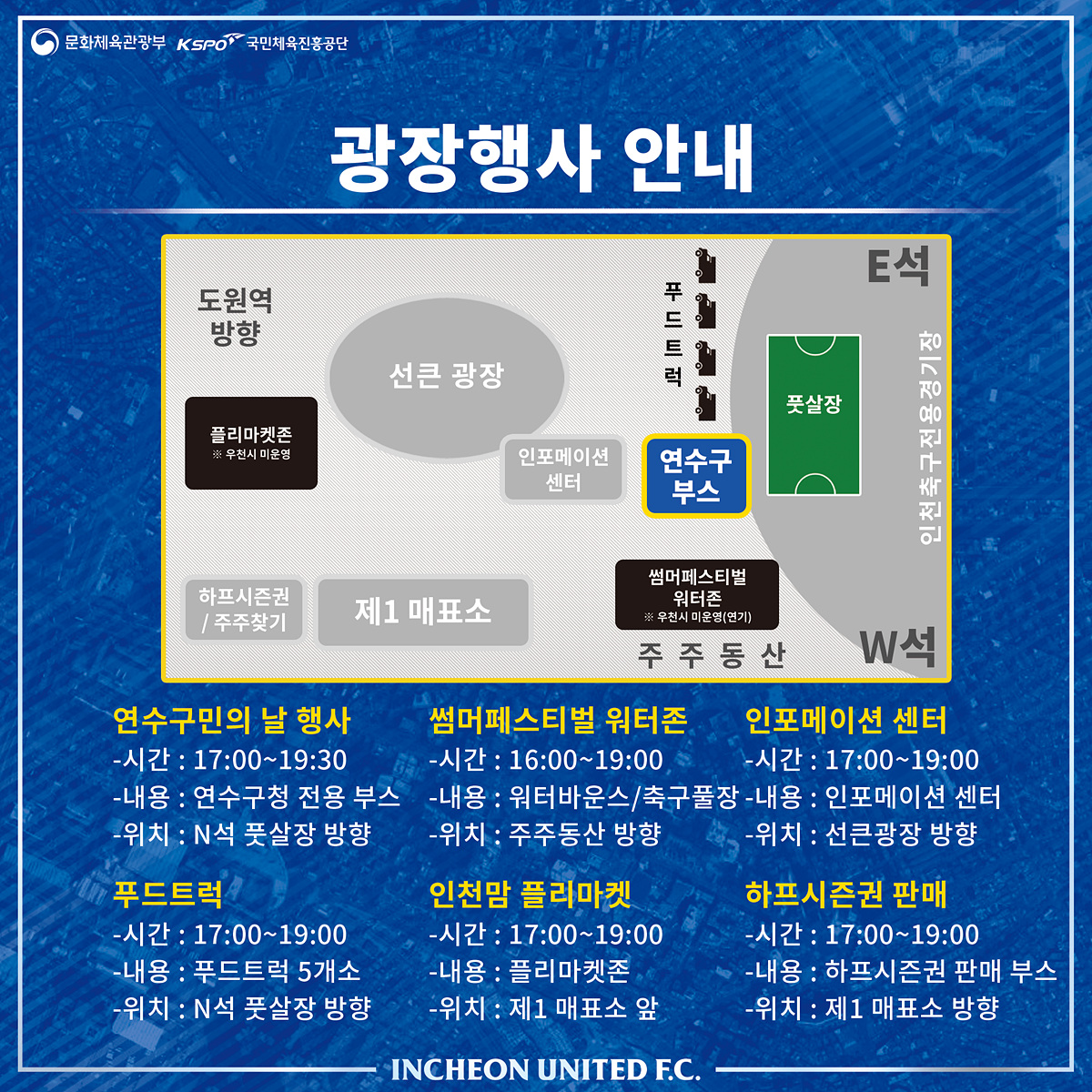이번 서울전 홈경기 북측 광장에서는 ‘썸머페스티벌 워터존’, ‘인천맘 소중한인연’ 플리마켓 등이 운영되며 우천 시에는 부득이하게 취소될 수 있습니다. 이밖에도 푸드트럭 5개소, 연수구청 전용 부스, 숨은 시민주주 찾기 캠페인 홍보 부스, 하프시즌권 판매 부스가 동시 운영될 예정이오니 팬 여러분의 많은 관심과 참여를 부탁드리겠습니다.