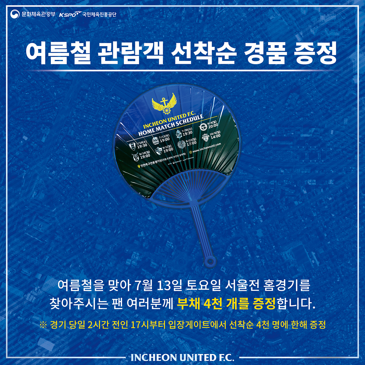 지난 수원전에 이어 이번 서울전에도 인천유나이티드 홈경기를 찾아와 주시는 홈 팬 여러분들께 시원한 부채를 선물로 드립니다. 경기 당일 2시간 전부터 선착순으로 4천 개를 드리오니 이점 참고해주시길 부탁드립니다.