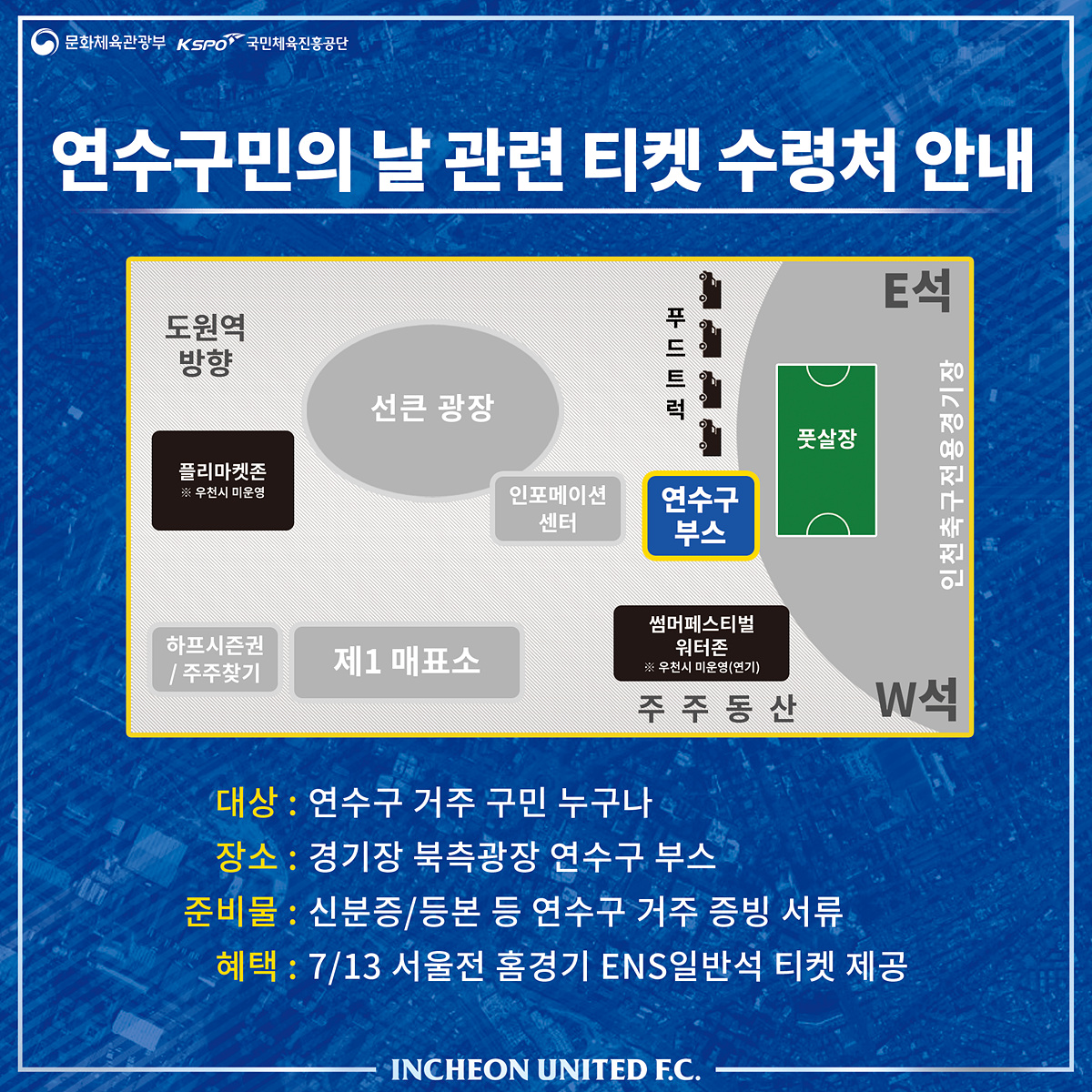 이번 서울전 홈경기는 ‘연수구민의 날’ 브랜드데이로 운영됩니다. 연수구민 여러분께서는 경기 당일 N석 풋살장 쪽에 있는 연수구청 전용 부스에 방문하셔서 연수구민임을 증명하는 신분증, 학생증, 등본 등 구비 서류를 제시하시면 서울전 홈경기 ENS일반석 티켓을 제공해드립니다.
