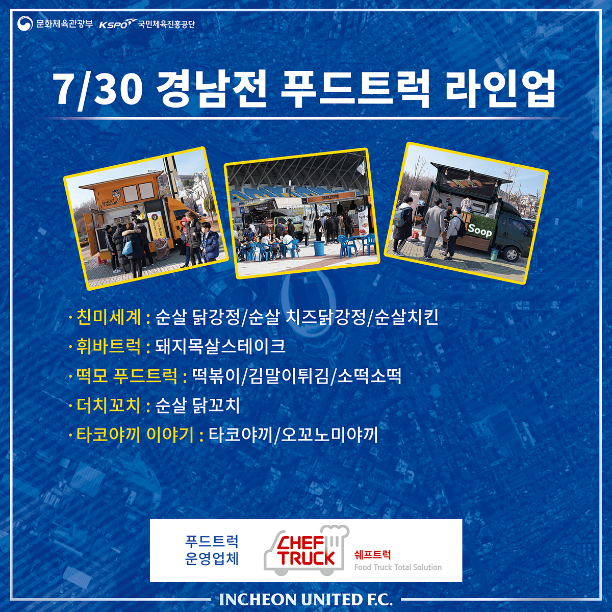 인천유나이티드 팬들의 입을 즐겁게 해주는 푸드트럭! 2019시즌에는 ‘쉐프트럭’과 함께하고 있습니다. 이번 경남전 홈경기에 찾아오는 푸드트럭의 메뉴 및 가격은 아래를 참고해주세요!