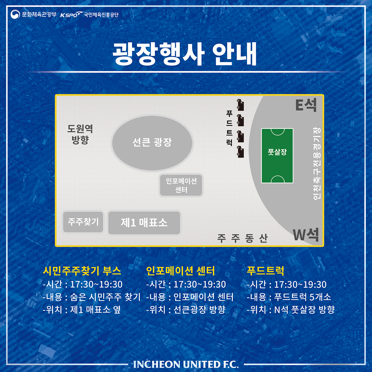 이번 경남전 홈경기 북측 광장에서는 시민주주 전용 부스가 운영되어 숨어있는 시민 주주 찾기 캠페인을 진행하고 있습니다. 또한, 선큰 광장 방향에서 인포메이션 센터 부스가 운영되어 각종 문의 사항에 답변해 드리고 있으니 인천 팬 여러분의 많은 관심과 참여를 부탁드립니다.