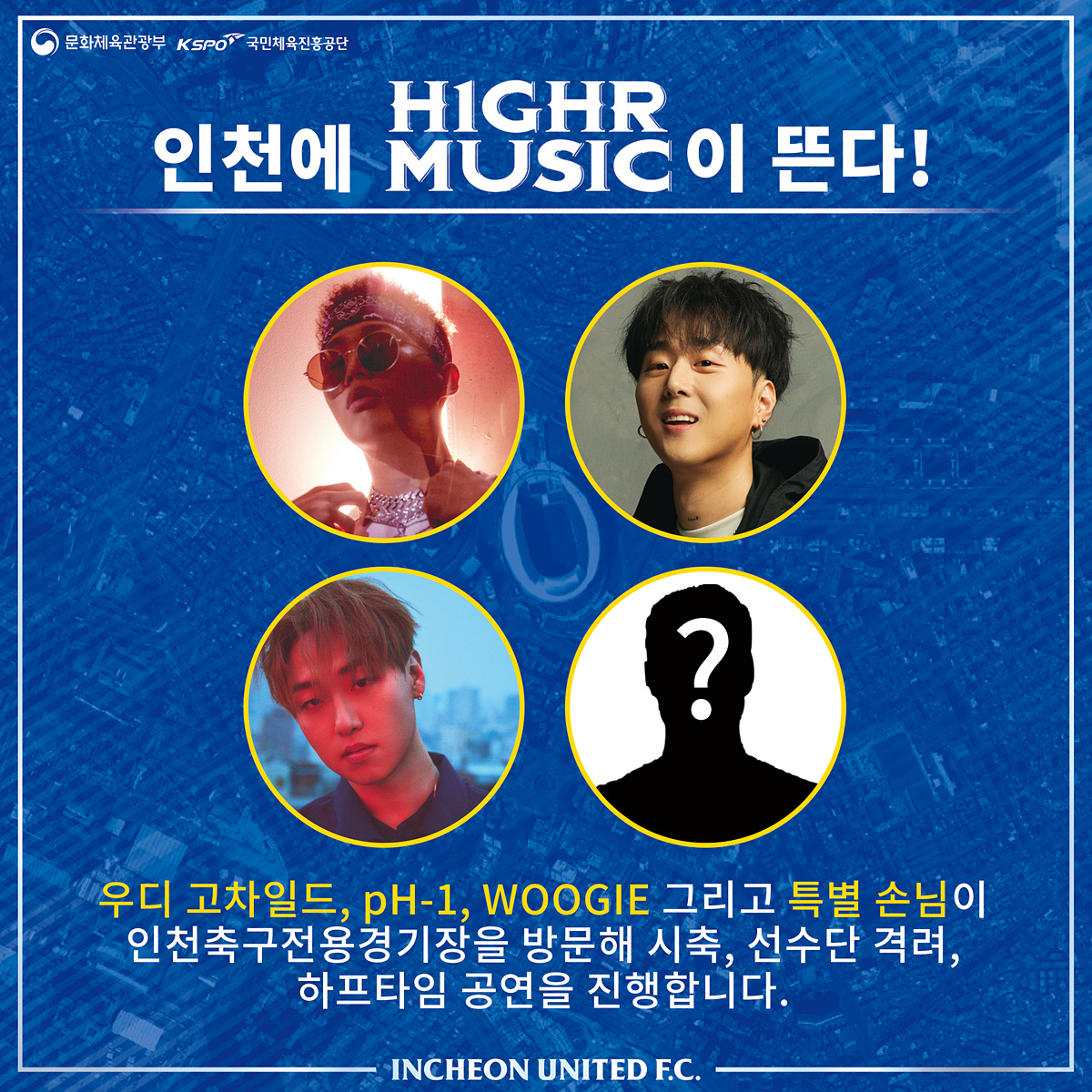 “우디 고차일드, pH-1, 우기가 인천축구전용경기장에 뜬다!” 이번 경남전 홈경기 하프타임에는 하이어뮤직의 대세 뮤지션들이 화요일 밤 공연을 펼칠 예정입니다. 또 지난 3/9 경남전 이벤트 공약이었던 ‘특별한 손님’의 공연도 예정되어 있으니 경기장에 많이들 찾아오셔서 화요일 밤의 뜨거운 공연을 즐기시길 바랍니다!