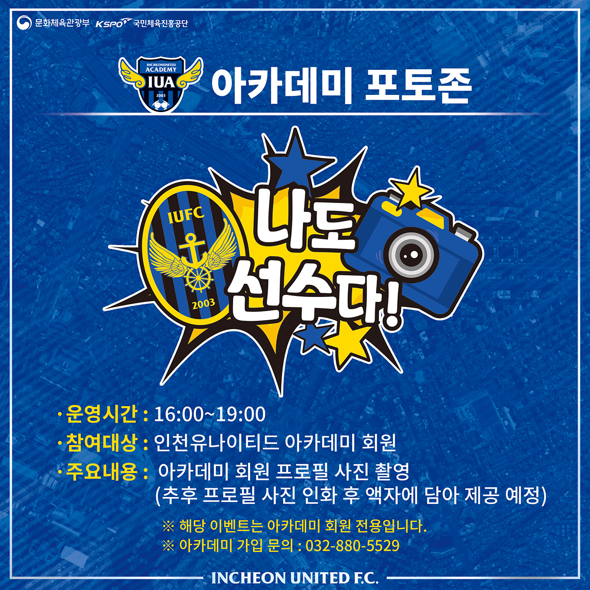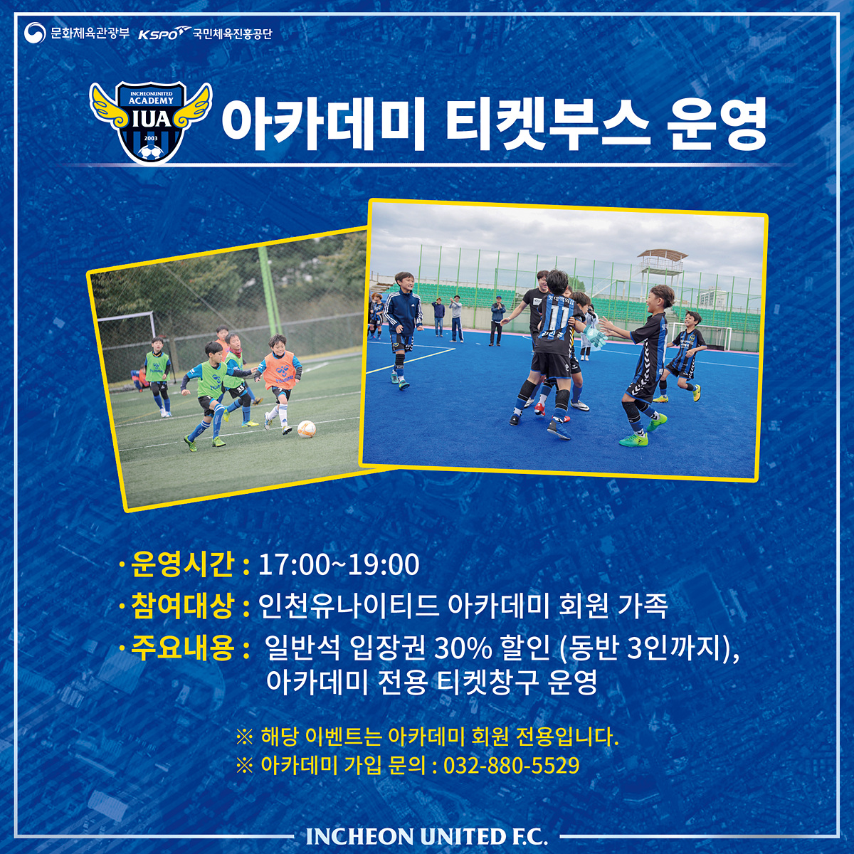 이번 제주전 홈경기에서는 인천유나이티드가 아카데미 축구교실 회원을 위한 특별 이벤트를 준비했습니다. 선수처럼 오피셜 사진 촬영을 체험할 수 있는 ‘나도 선수다’ 포토존과 아카데미 회원 가족 대상 30%의 티켓 할인을 받을 수 있는 티켓 전용 부스가 북측광장에서 운영되오니 아카데미 회원들의 많은 참여를 부탁드립니다.