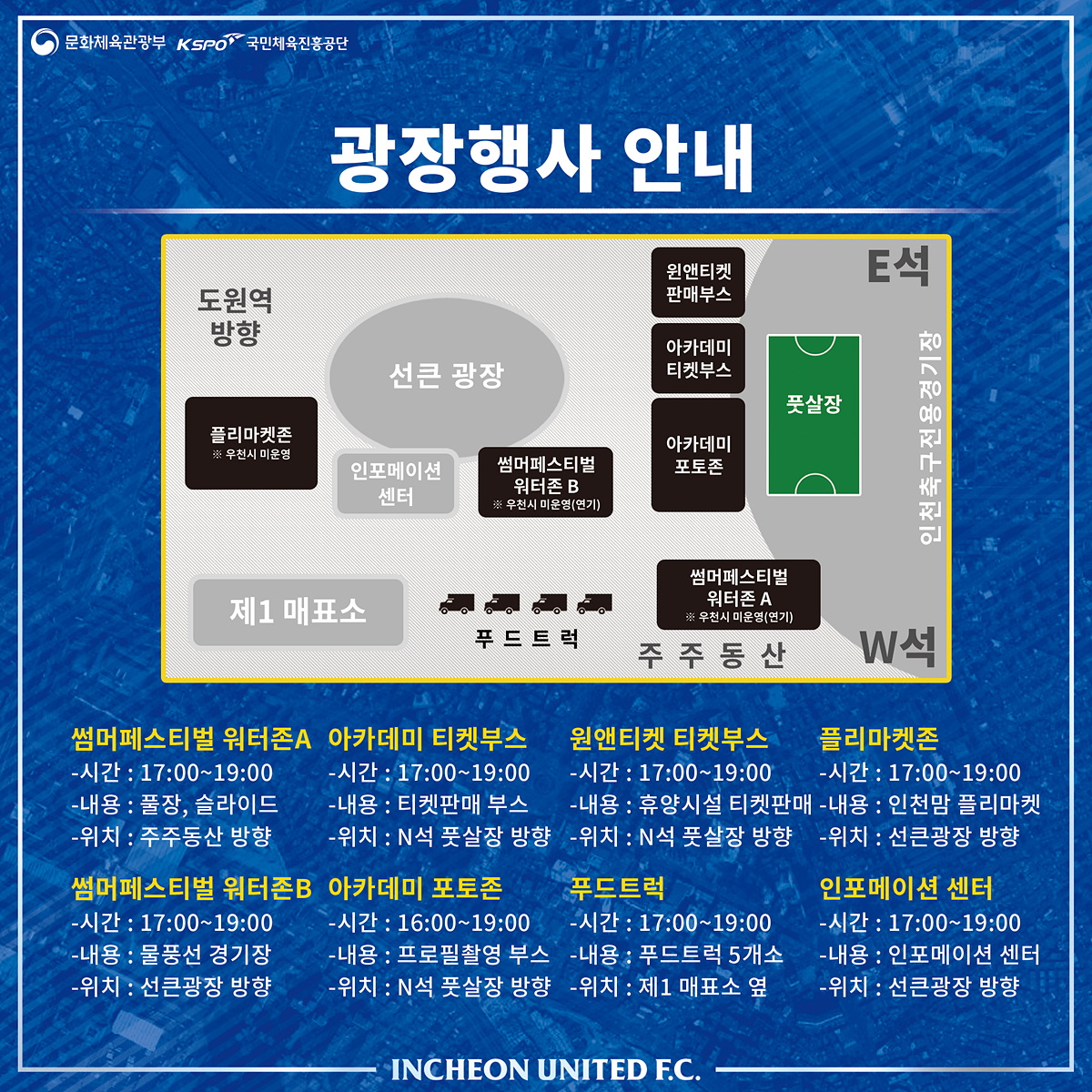 이번 제주전 홈경기 북측 광장에서는 푸드트럭 5개소를 비롯해 썸머페스티벌 워터존 2개소, 아카데미 전용 부스 2개소, 윈앤티켓 특별할인 전용부스 등이 운영되며 선큰 광장 방향에서는 인천맘 소중한인연의 플리마켓이 열릴 예정입니다. 플리마켓존 옆에선 인포메이션 센터 부스가 운영되어 각종 문의 사항에 답변해 드리고 있으니 인천 팬 여러분의 많은 관심과 참여를 부탁드립니다.